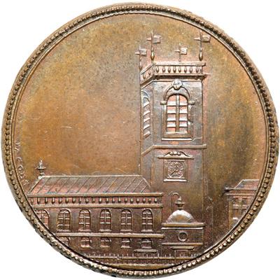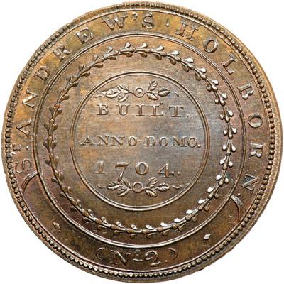 Middlesex. Skidmore's. Halfpenny, ND. D&H-595. Edge: SKIDMORE HOLBORN LONDON. View of church. Reverse: St. Andrew's. Holborn. three circles. NGC graded MS-65 Brown.