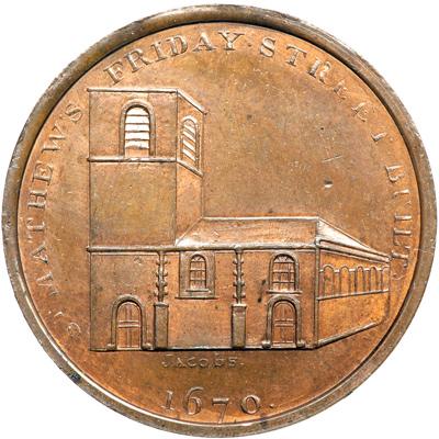 Middlesex. Skidmore's. Halfpenny, ND. D&H-585. Edge: Plain. St. Mathew's Friday - Street Built 1670. Reverse: Cypher. NGC graded MS-64 Red & Brown.