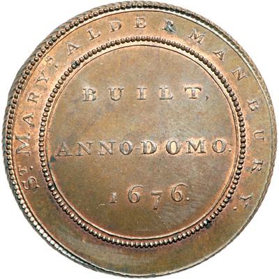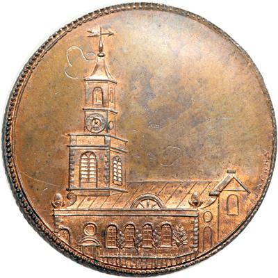 Middlesex. Skidmore's. Halfpenny, ND. D&H-539c. Edge: Course Milling. View of church. Reverse: Legend. NGC graded MS-64 Red & Brown.