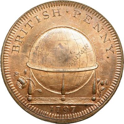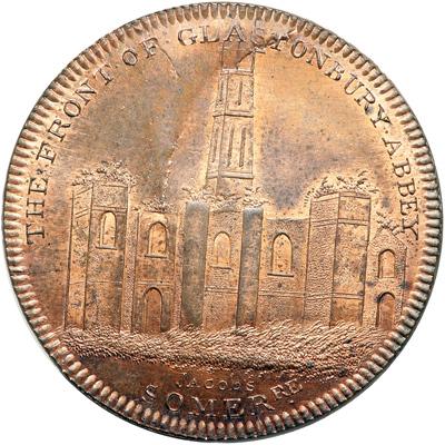 Middlesex. Skidmore's. Penny, 1797. D&H-135. Edge: I PROMISE TO PAY ON DEMAND THE BEARER ONE PENNY. Skidmore's Globe Series. Somersetshire. Glastonbury Abbey. Scarce. NGC graded MS-64 Red & Brown.