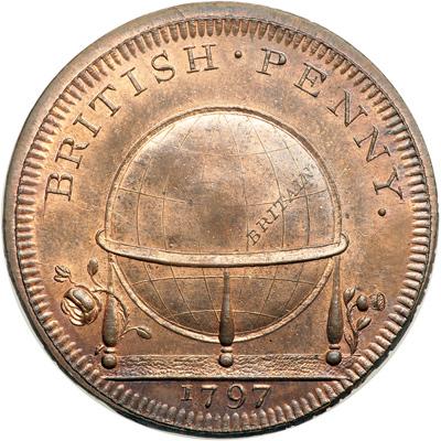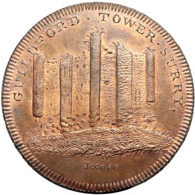 Middlesex. Skidmore's. Penny, 1797. D&H-138. Edge: I PROMISE TO PAY ON DEMAND THE BEARER ONE PENNY. Skidmore's Globe Series. Surrey. Guildford Tower. Scarce. NGC graded MS-65 Red & Brown.