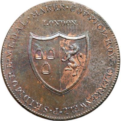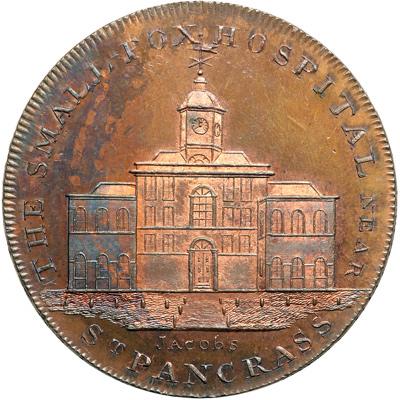 Middlesex. Skidmore's. Penny, ND. D&H-161. Edge: I PROMISE TO PAY ON DEMAND THE BEARER ONE PENNY. Skidmore's Clerkenwell Series. Small-Pox Hospital Near St. Pancrass. Scarce. NGC graded MS-64 Brown.