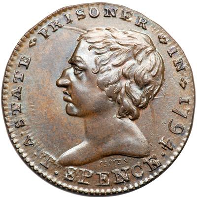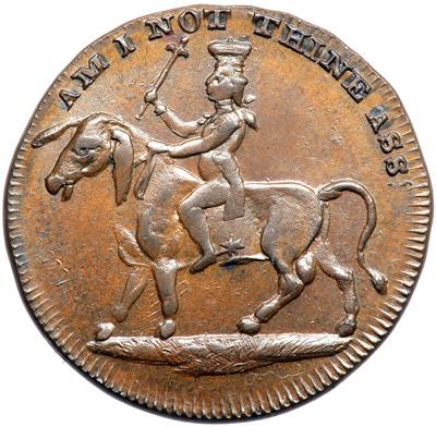 Middlesex. Spence's. Farthing, 1794. D&H-1078. Edge: Plain. Bust to left, James under. Reverse: A man riding on a bull with an ass's head. AM I NOT THINE ASS. NGC graded MS-66 Brown.