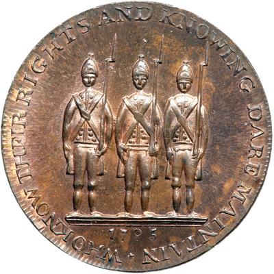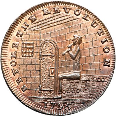 Middlesex. Spence's. Halfpenny, 1795. D&H-851. Edge: PAYABLE IN LONDON. A man sitting in prison gnawing a bone. Reverse: Citizens armed. Scarce. NGC graded MS-66 Red & Brown.