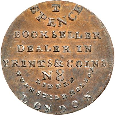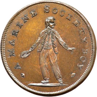 Middlesex. Spence's. Halfpenny, ND. D&H-698. Edge: SPENCE DEALER IN COINS LONDON. Legend. Reverse: A Marine Society boy. Rare. NGC graded MS-65 Brown.