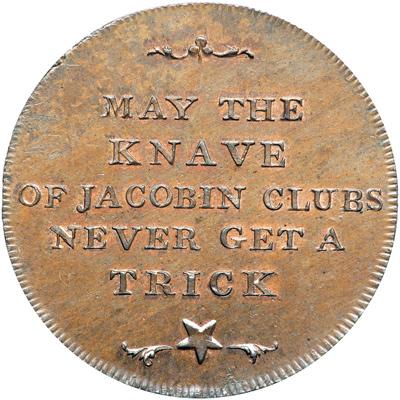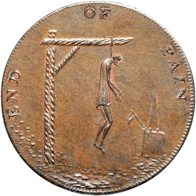 Middlesex. Spence's. Halfpenny, ND. D&H-831a. Edge: Plain (not in collar). A man hanging on a gibbet with a church in the distance. Reverse: Legend. NGC graded MS-65 Brown.