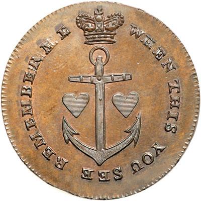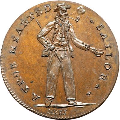 Middlesex. Spence's. Halfpenny, ND. D&H-857. Edge: SPENCE DEALER IN COINS. A Sailor. Reverse: Crown and anchor between hearts. NGC graded MS-65 Brown.