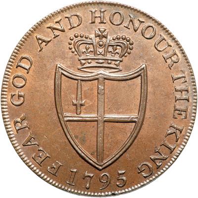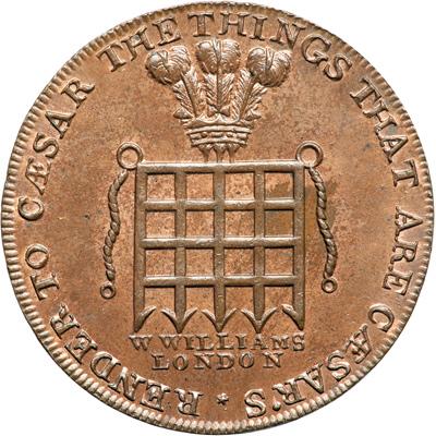 Middlesex. Williams. Halfpenny, 1795. D&H-915. Edge: Plain. The Prince of Wales crest upon a portcullis. Reverse: A crown on the arms of London. NGC graded MS-65 Brown.