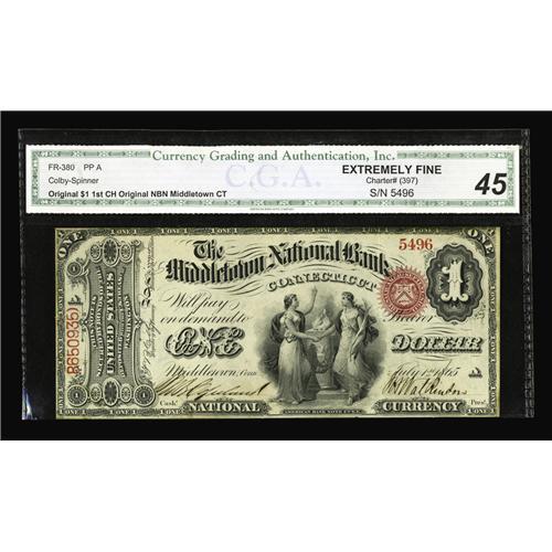 <B>Middletown, CT</B></I> - $1 Original Fr. 380 <B>The Middletown NB</B></I> Ch. # 1216<BR>This high end First Charter one is trimmed close all around in the typical New England manner. It has been graded and encapsulated by CGA, earning the <B>Extremely Fine 45</B></I> designation. The holder incorrectly identifies the charter number as 397.
