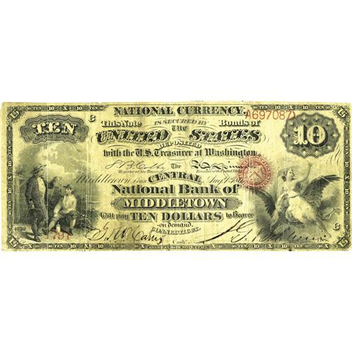<B>Middletown, CT</B></I> - $10 Original Fr. 412 <B>The Central NB</B></I> Ch. # 1340<BR>This piece, which is new to the census, joins two others as the only First Charters extant on this charter. It's a decent enough note, although there are a couple of splits at the somewhat ink eroded signatures. This is a better Connecticut type and denomination, with just eight Original Series tens reported from all banks in the state combined. <B>Fine.</B></I>
