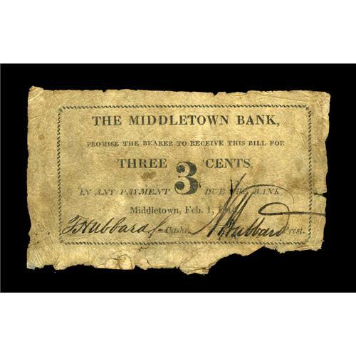 <B>Middletown, NY- The Middletown Bank</B></I> 3¢ Feb. 1, 1816 Haxby UNL Harris UNL<BR>This "institution" was almost certainly a private venture lacking a banking license, as it is unlisted in Dillistin's <I>Historical Directory of the Banks of the State of New York."</B></I> <B>Very Good,</B></I> with a few petty holes.</B></I>