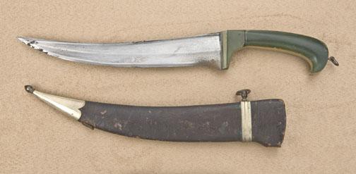 Mideastern dagger with green hard stone handle, possibly jade. Water steel blade, original scabbard, showing good quality. 19th century. Measures 11-7/8” overall, with approx. 8” blade. Est: $600 - $1,200