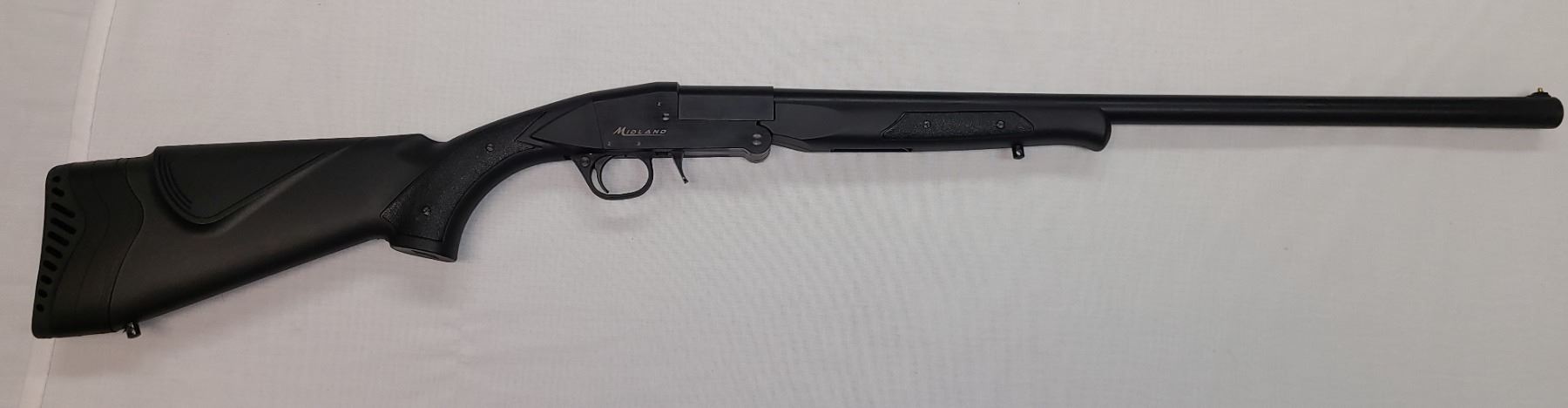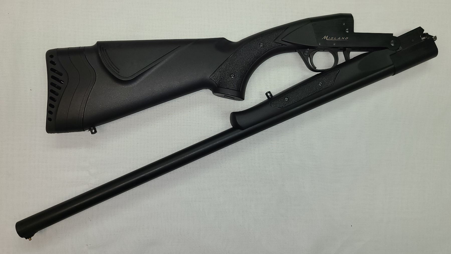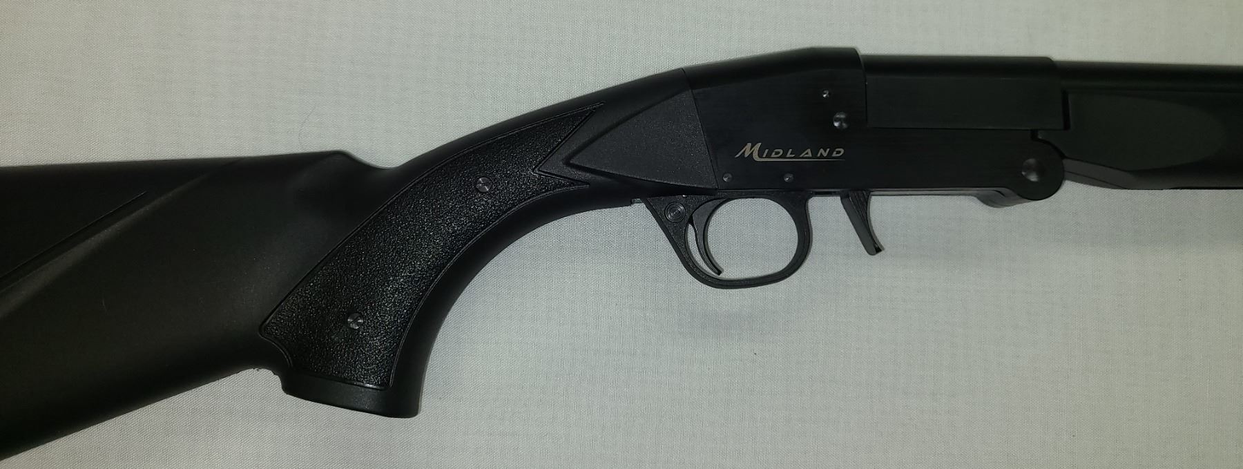 Midland 12ga Folding Shotgun (New) New (No box) - this is a Turkish made single shot 12ga shotgun. Folds up nice and small for easy storage and transport. Great simple hammer style shotgun. Only one modified choke is supplied. Condition New - Barrel length is 24" and takes 3" shells.......