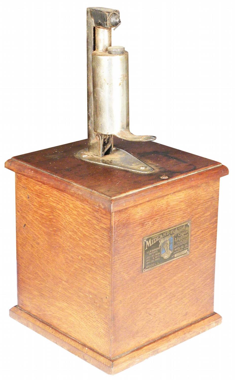 Midland Jump Spark Cigar Lighter. Model L # 127091, 1920. Davenport Mfg. Davenport, IA. Oak cabinet, good original condition.