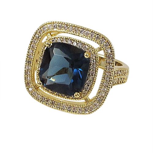 Midnight Blue Square Crystal Surrounded With A Double Row Of White Czs, Gold Tone Brass Ring Size 7