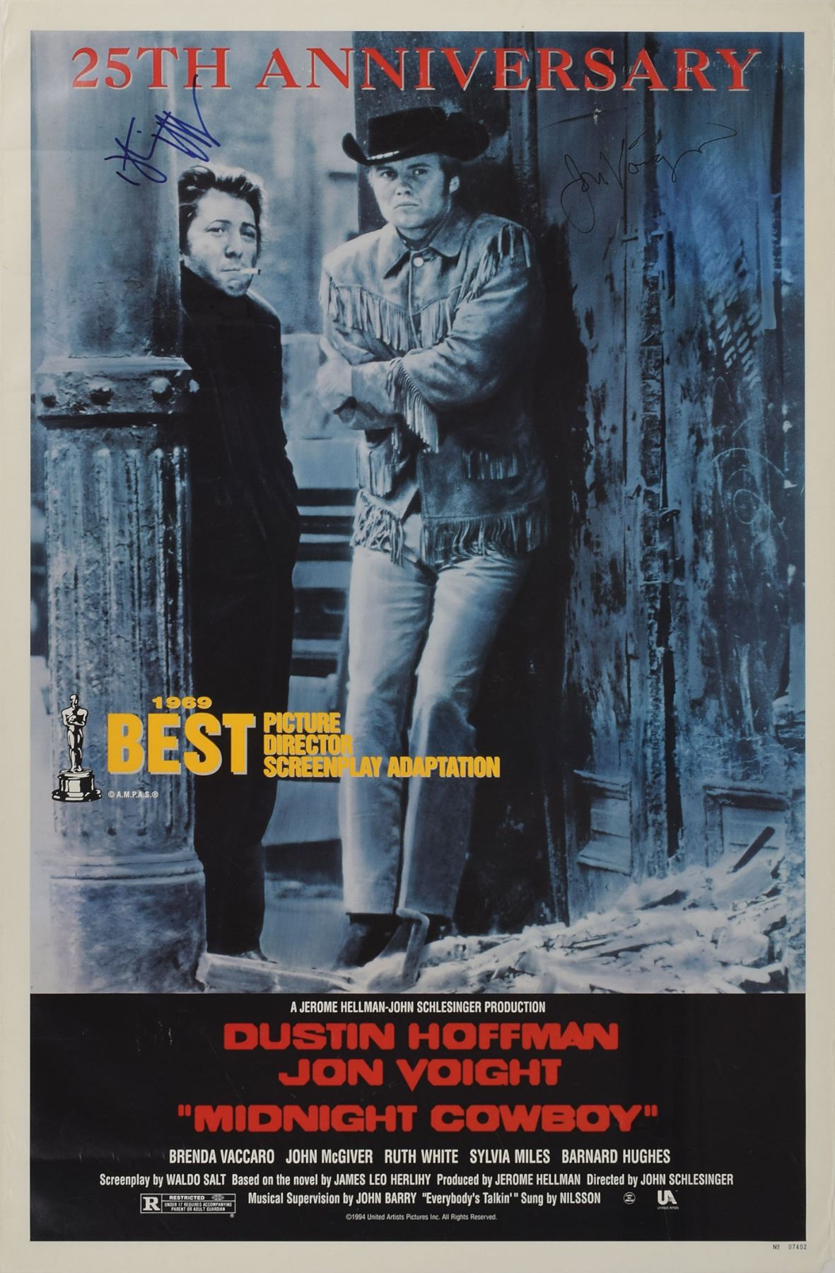 Color 27 x 41 poster for the 25th anniversary of Midnight Cowboy, signed in blue felt tip by Dustin Hoffman and black felt tip by Jon Voight. Rolled and in very good to fine condition, with scattered creasing and edge tears.
