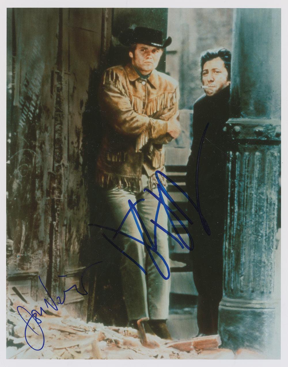 Color glossy 8 x 10 photo of Ratso Rizzo and Joe Buck, signed in-person in blue felt tip by Jon Voight and Dustin Hoffman. In very fine condition. Originally obtained by in-person specialist Mike Wehrmann.