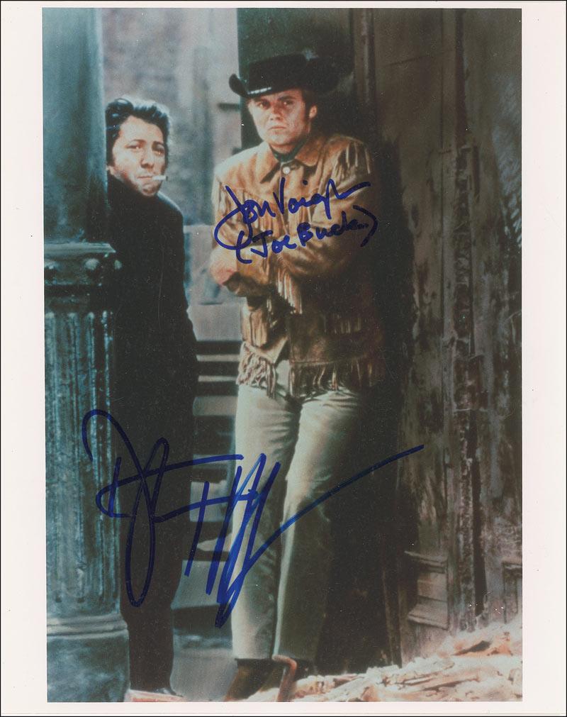 Color glossy 8 x 10 photo of Ratso Rizzo and Joe Buck, signed in-person in blue felt tip by Dustin Hoffman and Jon Voight, who also adds his character name. In very fine condition.