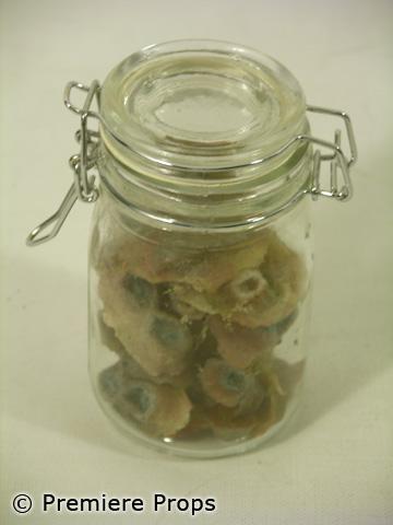 From the set of Midnight Meat Train, this is a glass jar with silicon skin shavings. (approx. 4.5"x2.5") (contents may vary slightly)