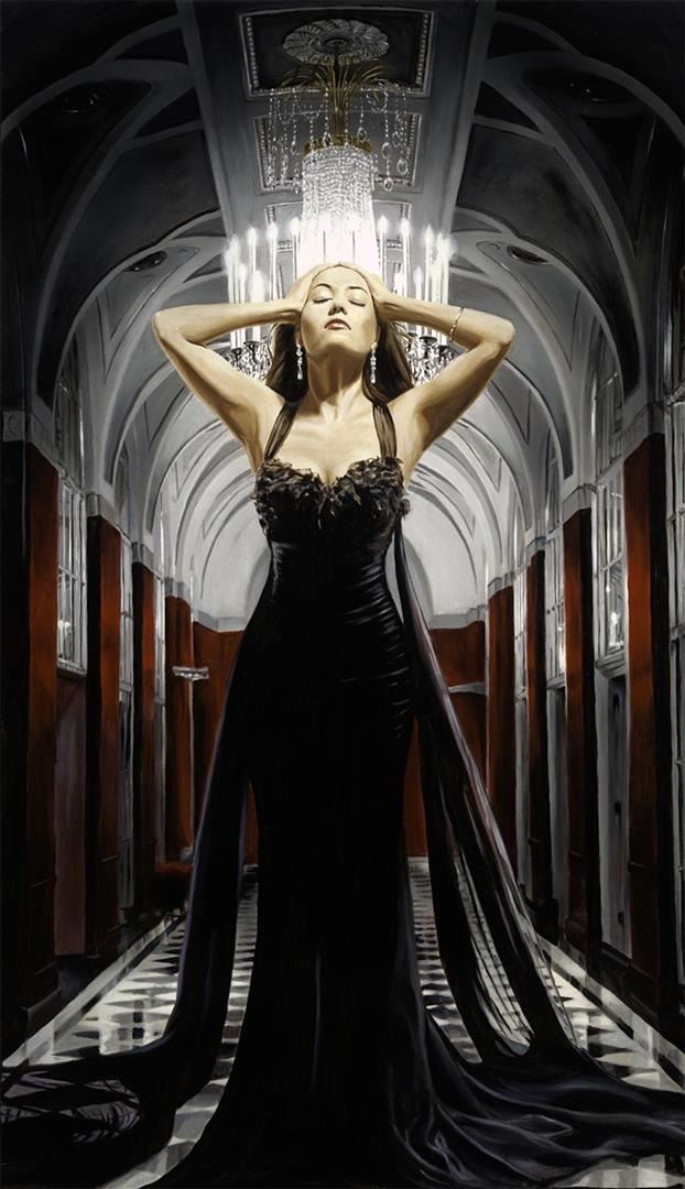In a 40"x24" giclee on canvas by DELLORCO, the grand Waldorf Astoria hotel is the locale for this moment of exhaltation after Midnight, S/N with COA.