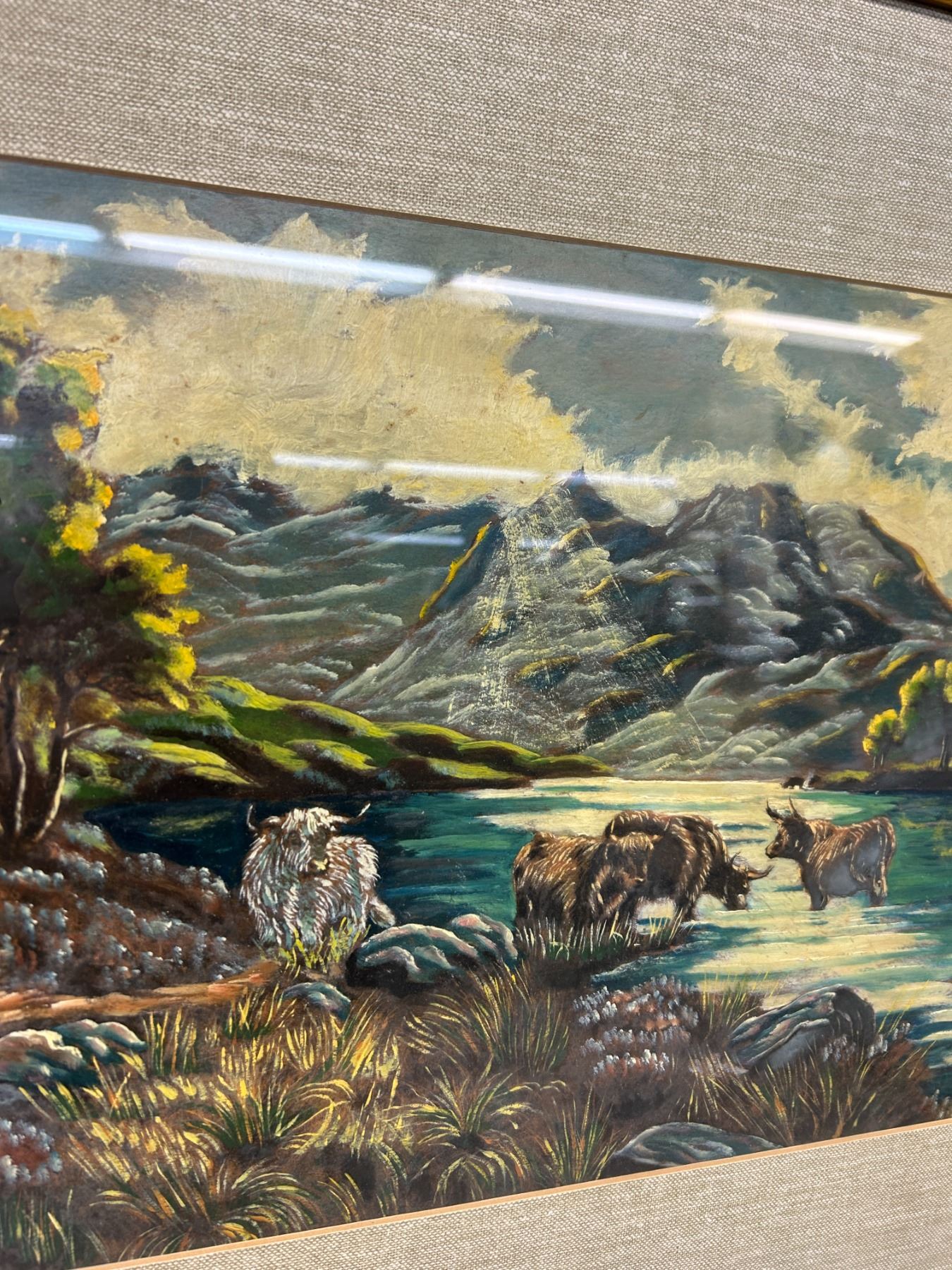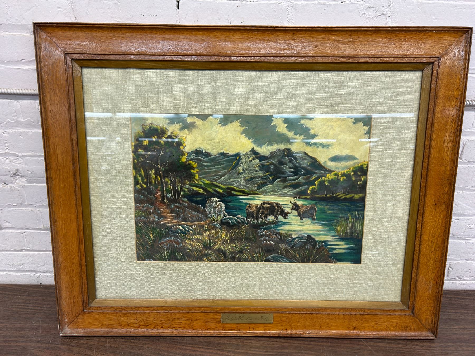 Midst Heather & Hills  Framed Original Painting Cows in Landscape, Vintage Antique 3ft x 28