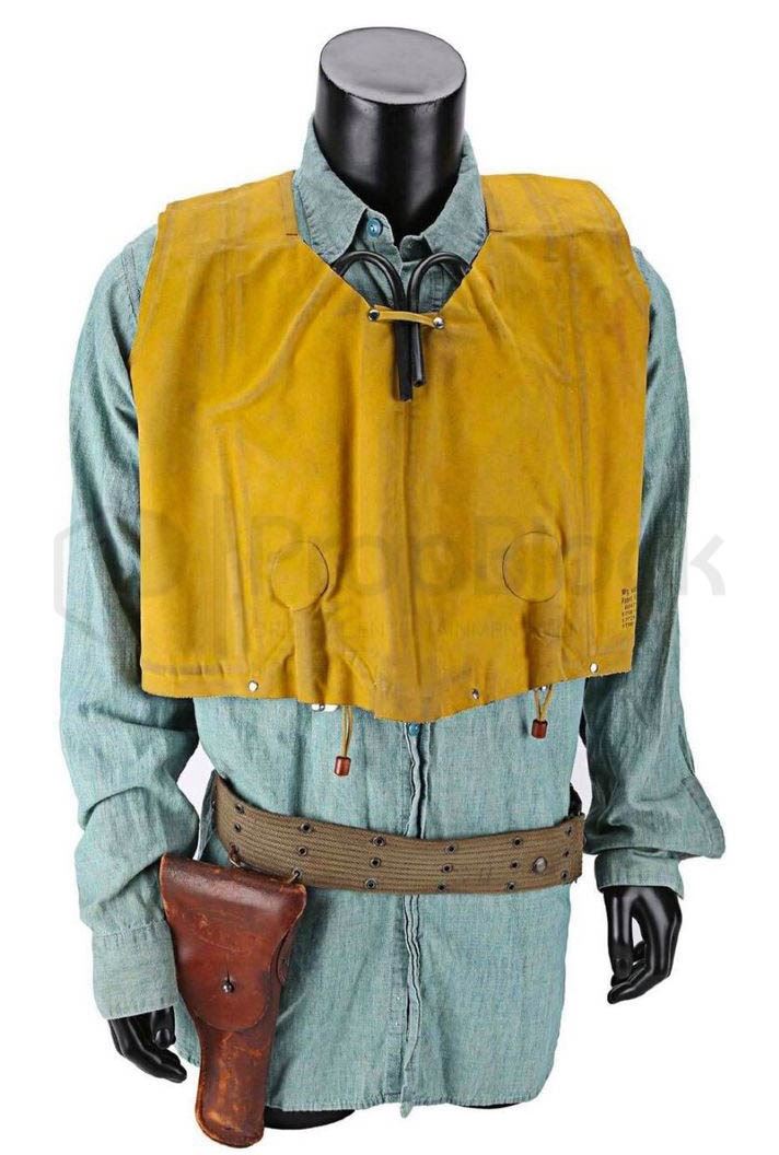 "Gunner" costume worn by the character of Bruno, actor Nick Jonas in the 2019 war thriller Midway. The story of the Battle of Midway, told by the leaders and the sailors who fought it. This piece consists of a blue button up long sleeved undershirt with a yellow non-inflated life vest and a brown belt with attached brown leather holster. This piece remaisn in excellent, production used condition.