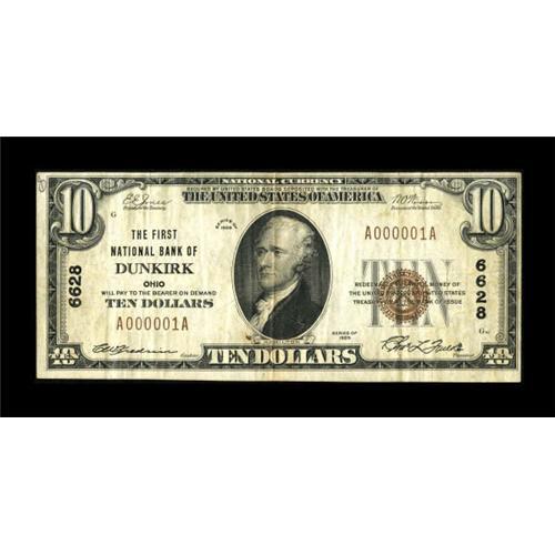 <B>Dunkirk, OH</B></I> - $10 1929 Ty. 1 <B>The First NB</B></I> Ch. # 6628<BR> This is a <B>Fine-Very Fine </B></I>serial number 1 $10 from the very first position on the first sheet. In fact it is the first serial number 1 note to show up on this Hardin County bank. This bank has produced only three auction appearances in the last dozen years, but the last time was way back in 1999.<BR><BR><b>Shipping:</b> Coins & Currency (<a target="_blank" href="http://www.heritageauctions.com/common/shipping.php">view shipping information</a>)