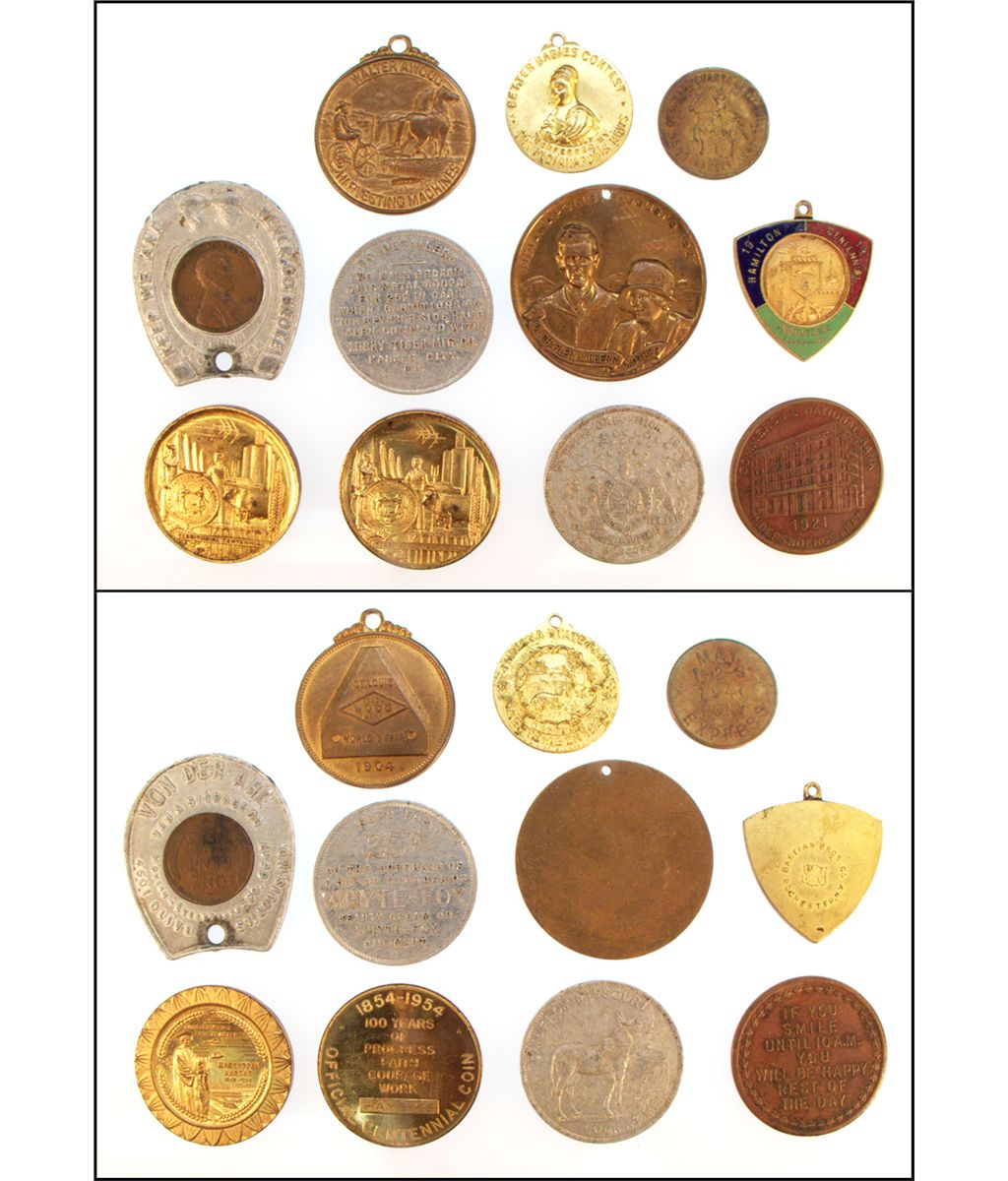 KANSAS TERRITORIAL CENTENNIAL PAIR- Hays / Manhattan 1954/55 2.) Independence, KS COMMERCIAL NATIONAL BANK 1921 3.) CORONADO CENTENNIAL // PONY EXPRESS KANSAS 1941 4.) WHYTE-FOX GF 25c Kansas City, MO (aluminium) 5.)Two from St. Louis W.F. 1904 / A. Wood HARVEST MACHINES & rare aluminium souvenir token w donkey on reverse 6.) Encased Cent-VON DER AHE St. Louis, MO 7.) Charles Lindberg & Mother Indianapolis, IN 1927 8.) Indiana State Fair- BETTER BABIES CONTEST 1930 9.)HAMILTON INDUSTRIAL CENTENNIAL 1913