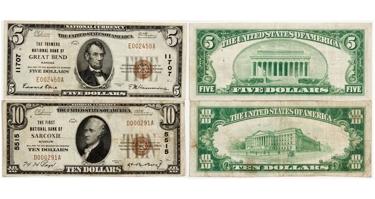 c1929 This is a duo, including a $5 from the Farmers National bank of Gret Bend, KS (Charter 11707, Type 1, vg-f) and and $10 from the First National Bank of Sarcoxie, MO (Charter 5515, Type 1, vg-f). - HKA#65695
