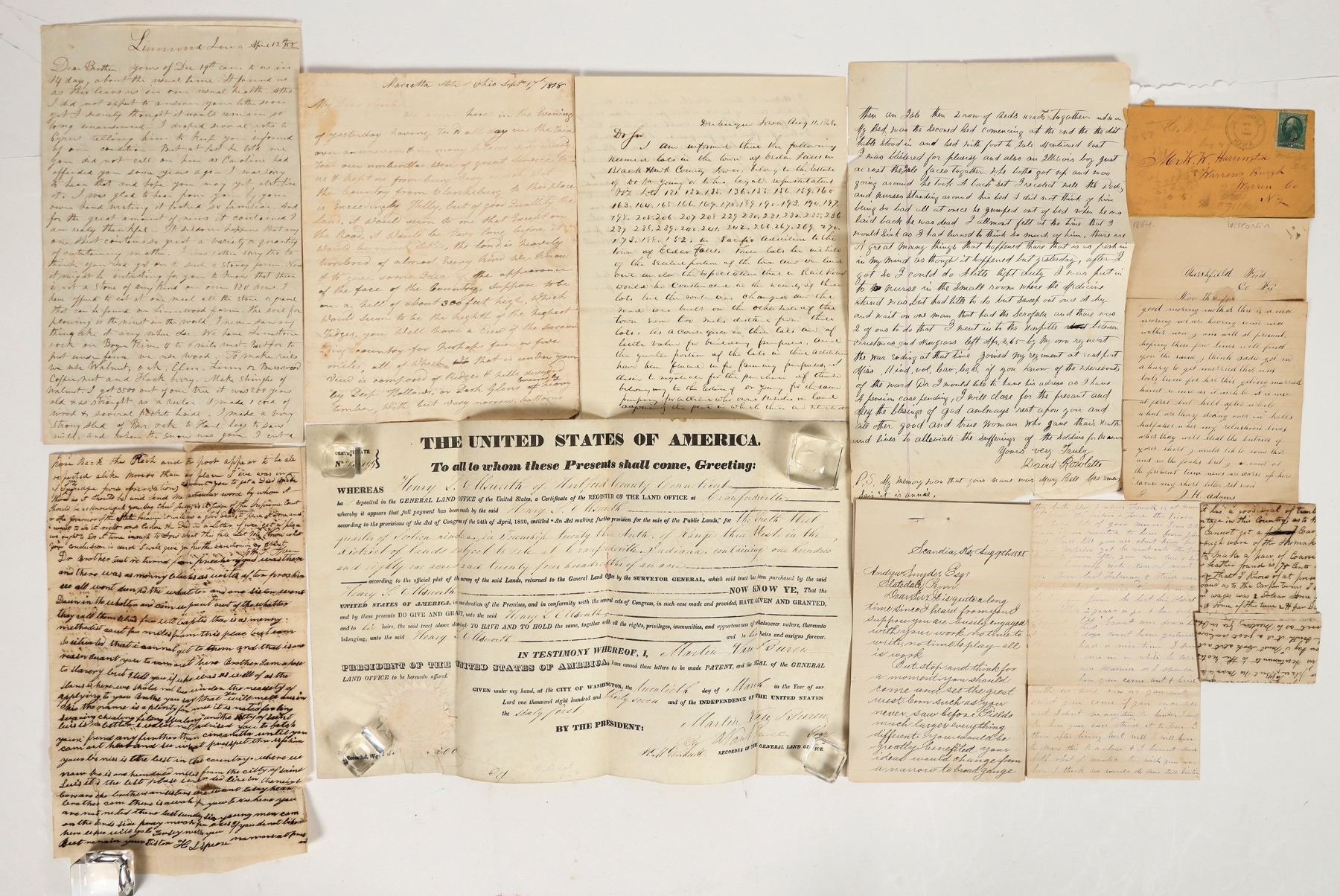 Large lot of correspondence from the midwest, ranging from Wisconsin to Indiana to Kansas to Iowa. There is a multi-page Abolition letter from 1836 in Missouri, a US Land Grant signed for President Martin Van Buren, and multiple hand-written letters from various sources and locations too numerous to list here. Roughly (12) different pieces, all in fair to good condition. This eclectic group would do well in any collection, please inspect.