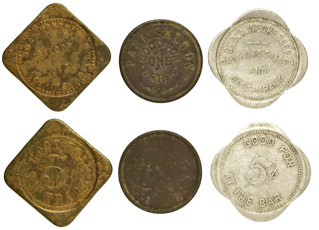 Lot of 3 saloon pieces including one for a free drink at the Park Saloon, possibly from Quincy, Illinois, Joe Bernstein`s Saloon for five cents credit and Good for five cents at the bar at Geo. A. Weckesser`s Klondike Saloon & Restaurant. The two Illinois