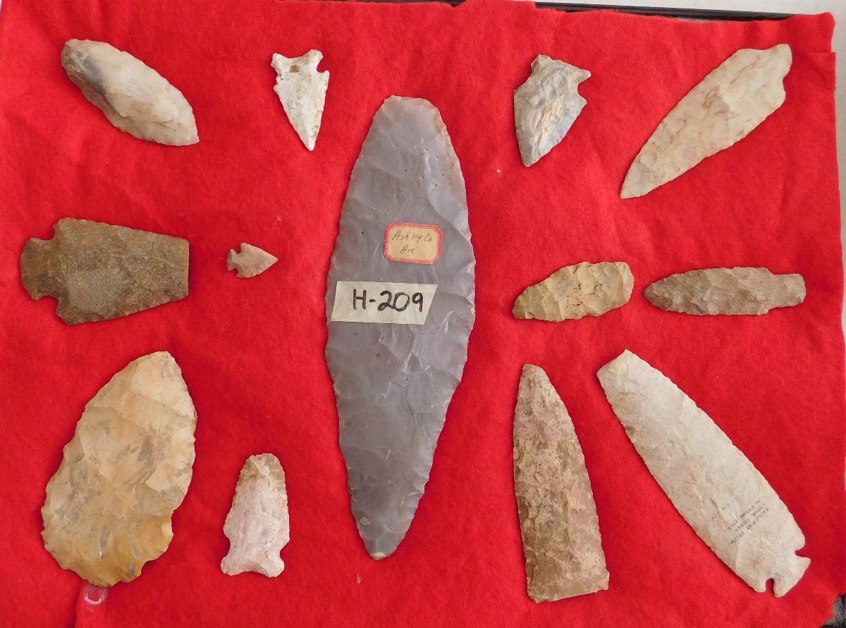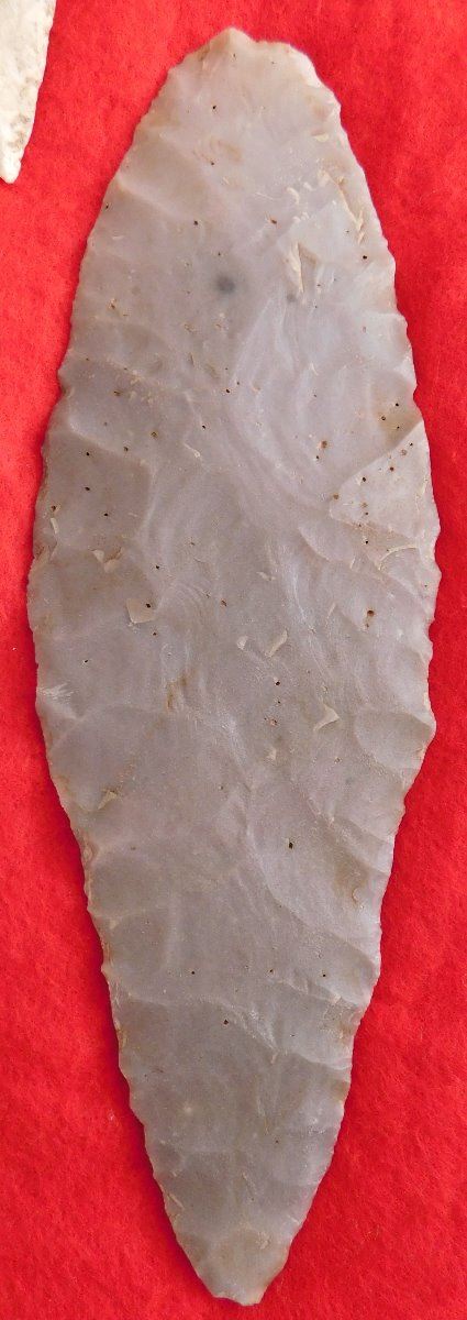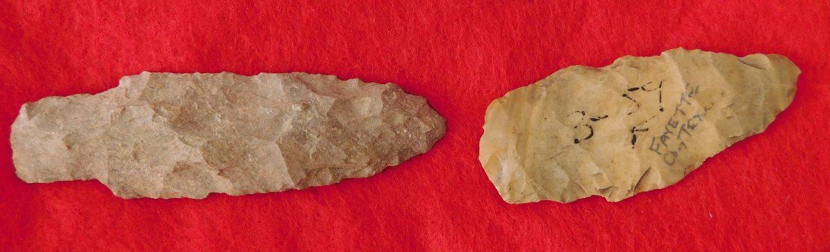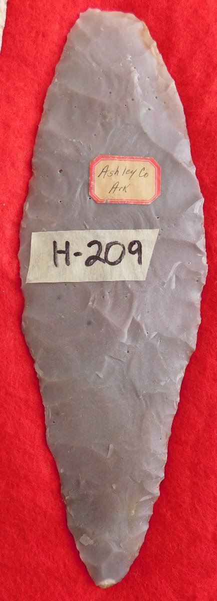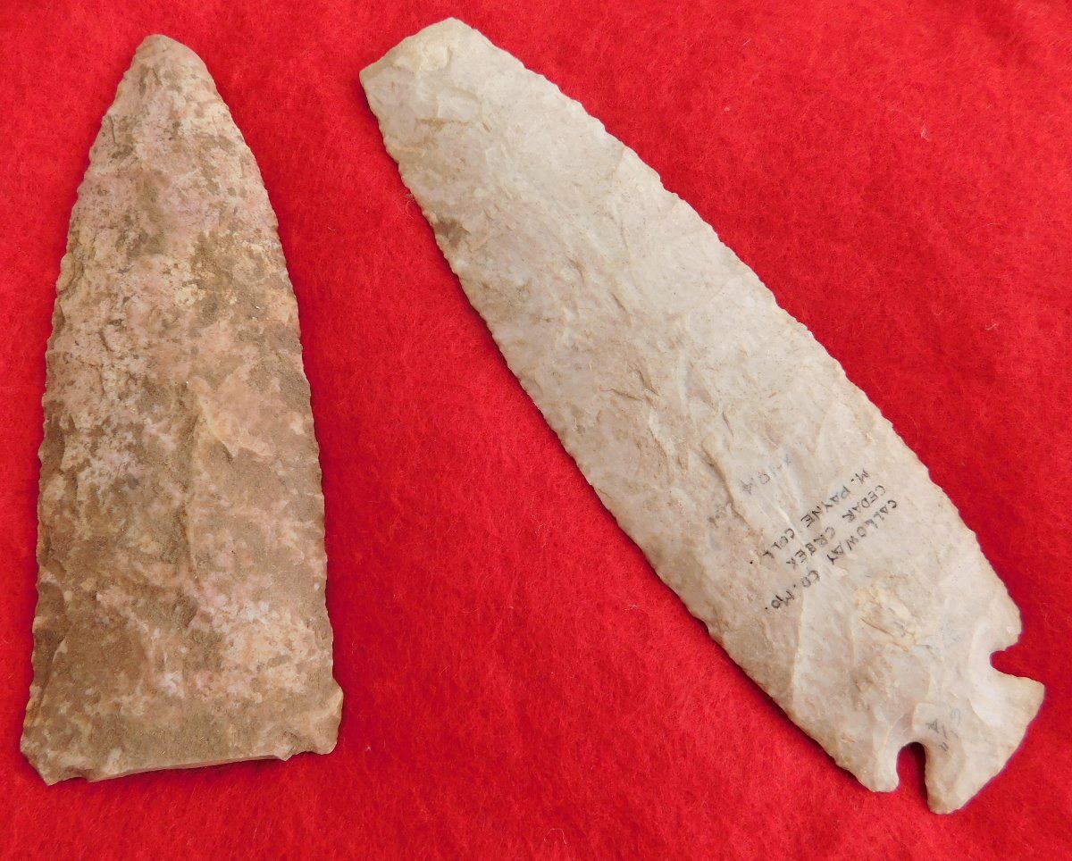Midwestern Flint Collection, pre-historic items. Made of chert, quartz and flint, the center blade is 8 7/8" long, from Ashley County, Arkansas. Broken dovetail from Payne collection, measures 6.5" long. Frame not included. Condition: As found, see images. Shipping: $35.00 USA estimate only, w/insurance and signature, double-boxed.