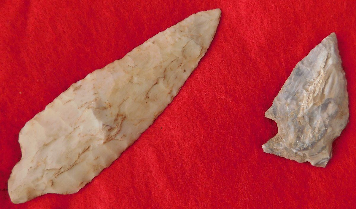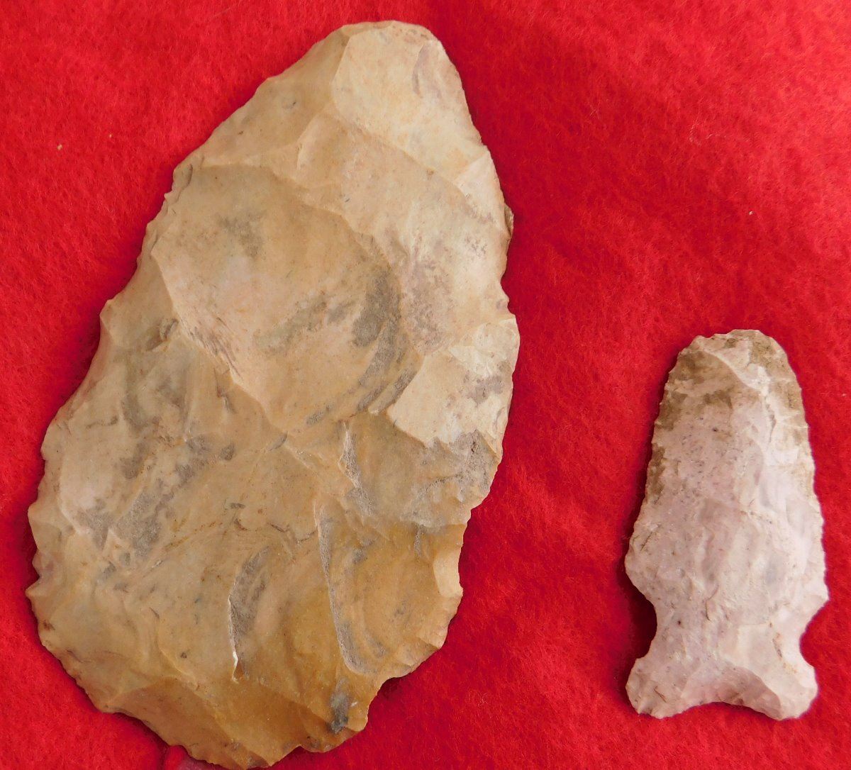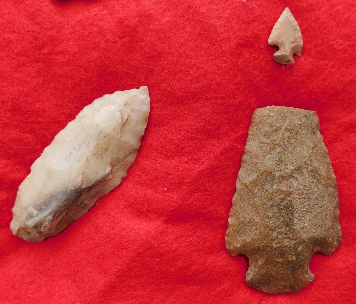 Midwestern Flint Collection, pre-historic items. Made of chert, quartz and flint, the center blade is 8 7/8" long, from Ashley County, Arkansas. Broken dovetail from Payne collection, measures 6.5" long. Frame not included. Condition: As found, see images. Shipping: $35.00 USA estimate only, w/insurance and signature, double-boxed.