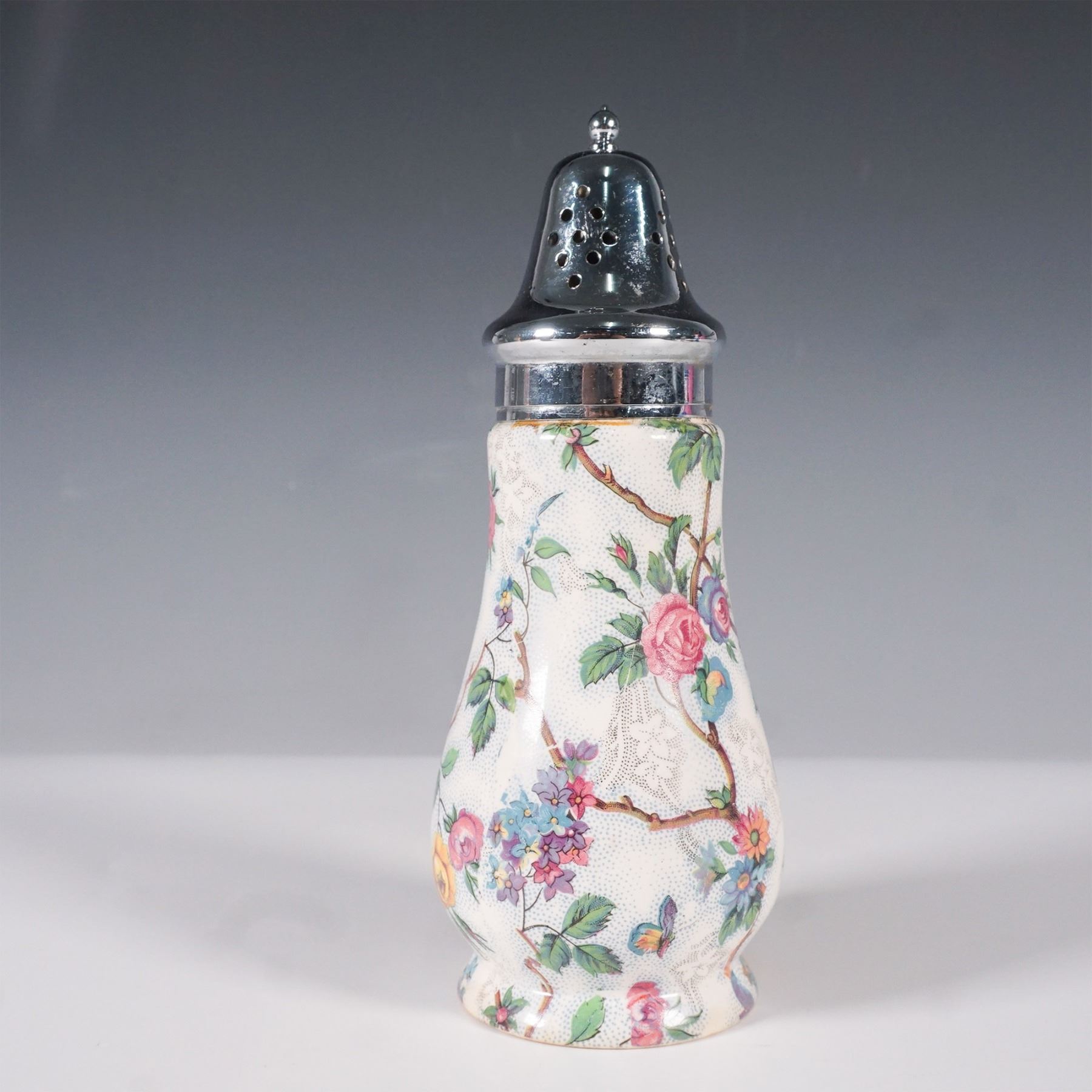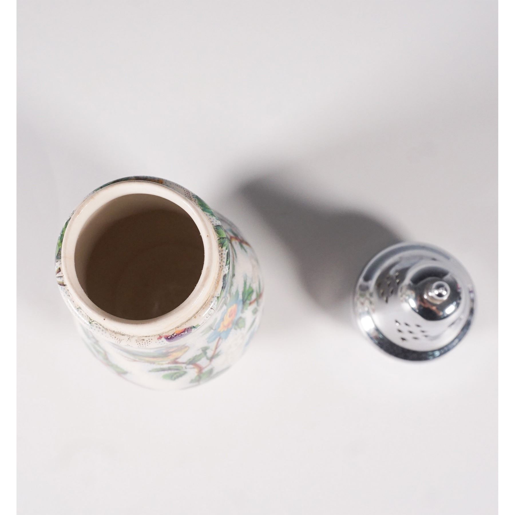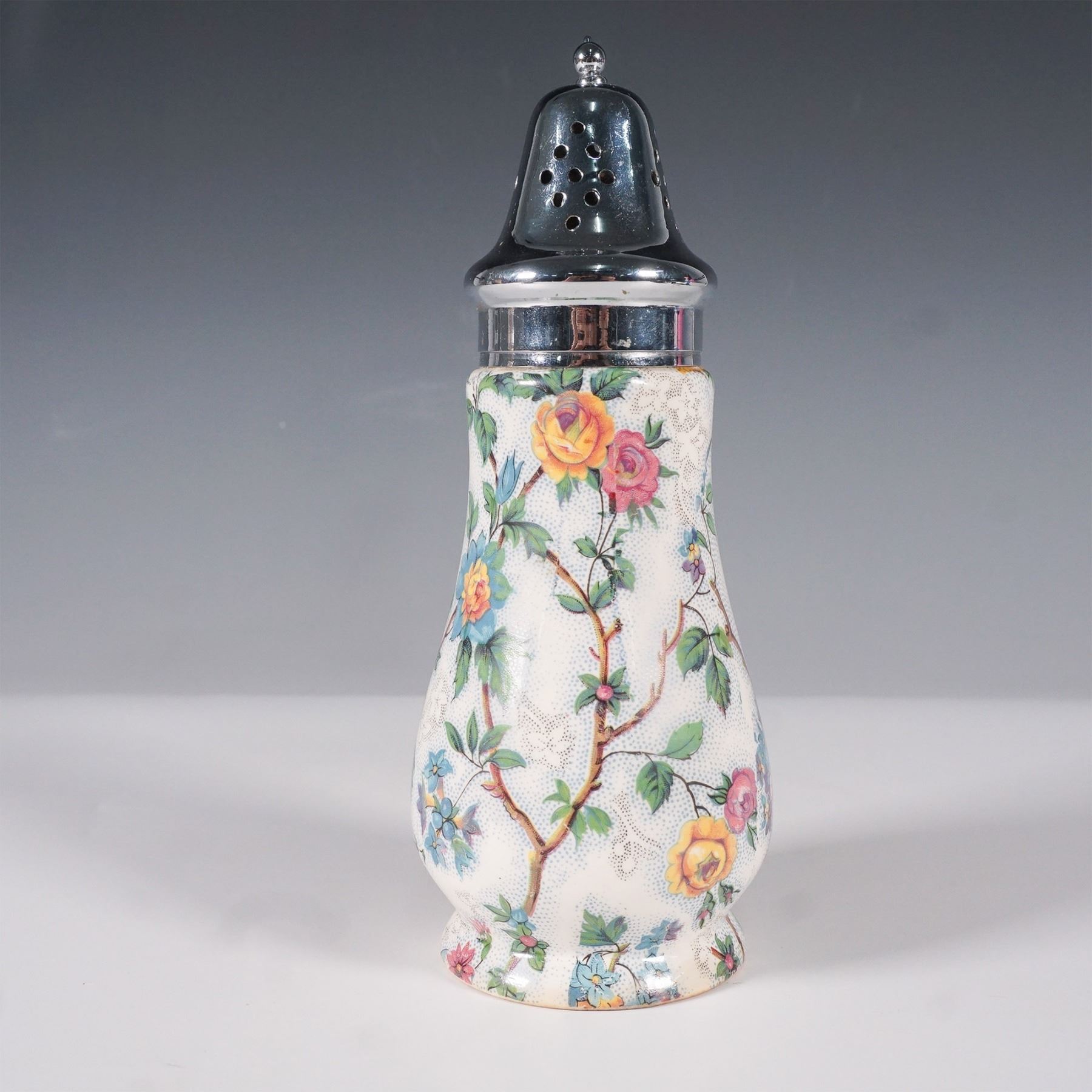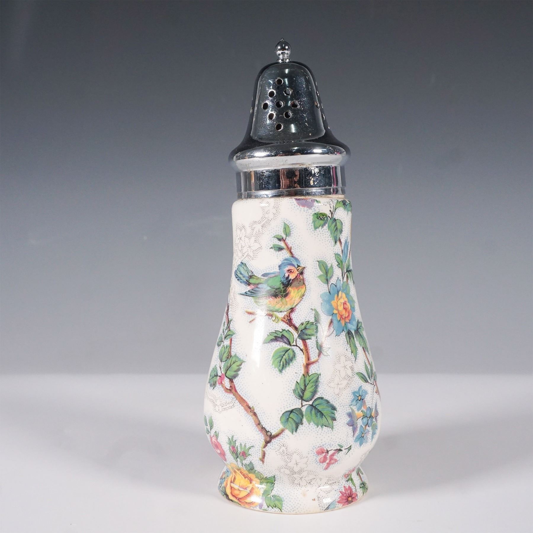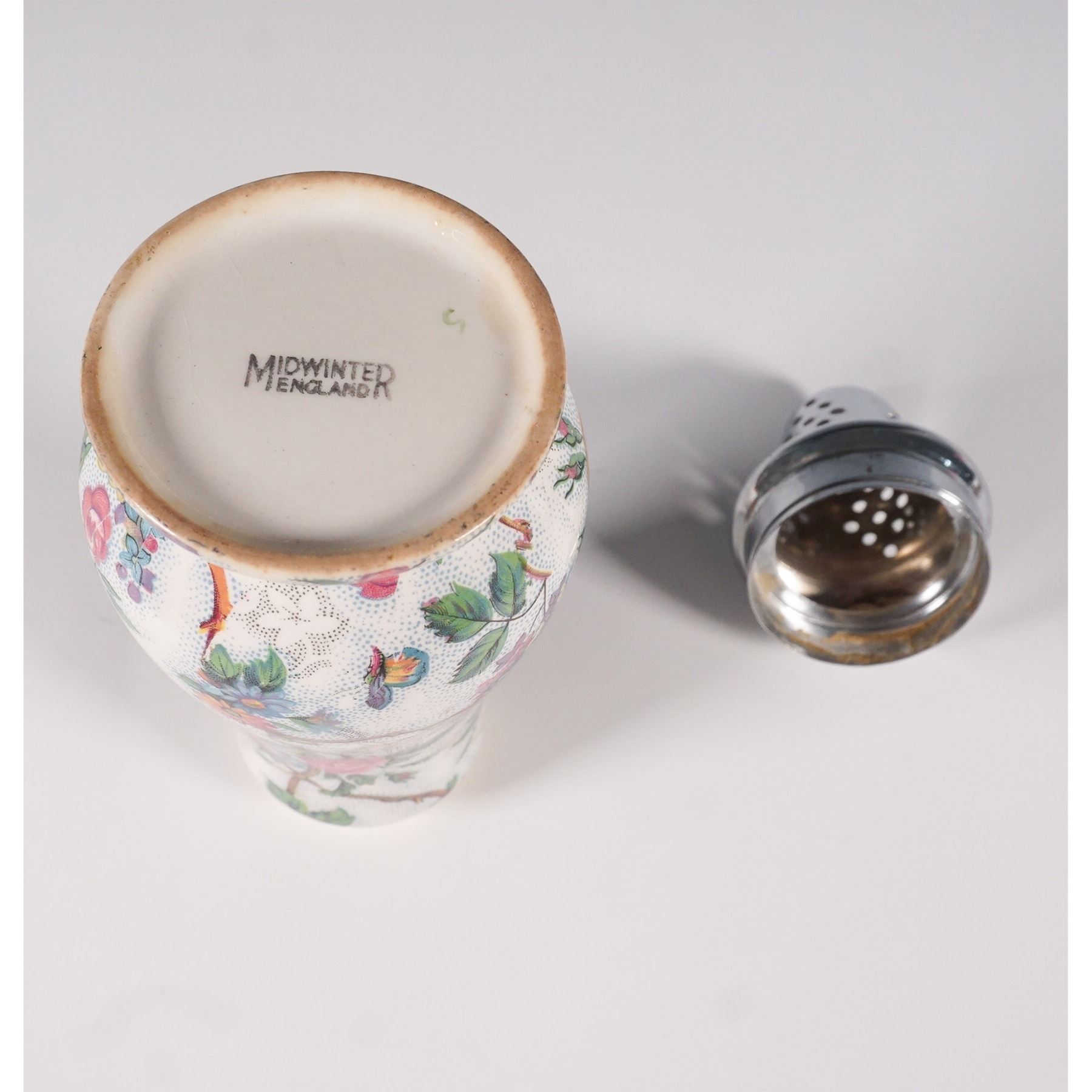 A Midwinter England chintz-pattern sugar shaker featuring a vibrant floral and bird motif against a cream-colored background. This vintage piece showcases intricate detailing with colorful roses, blossoms, and perched birds, adding charm and elegance to any collection. The shaker is topped with a removable silver-toned lid with perforations for dispensing. Marked with a Midwinter England backstamp on the underside, confirming its authenticity.
