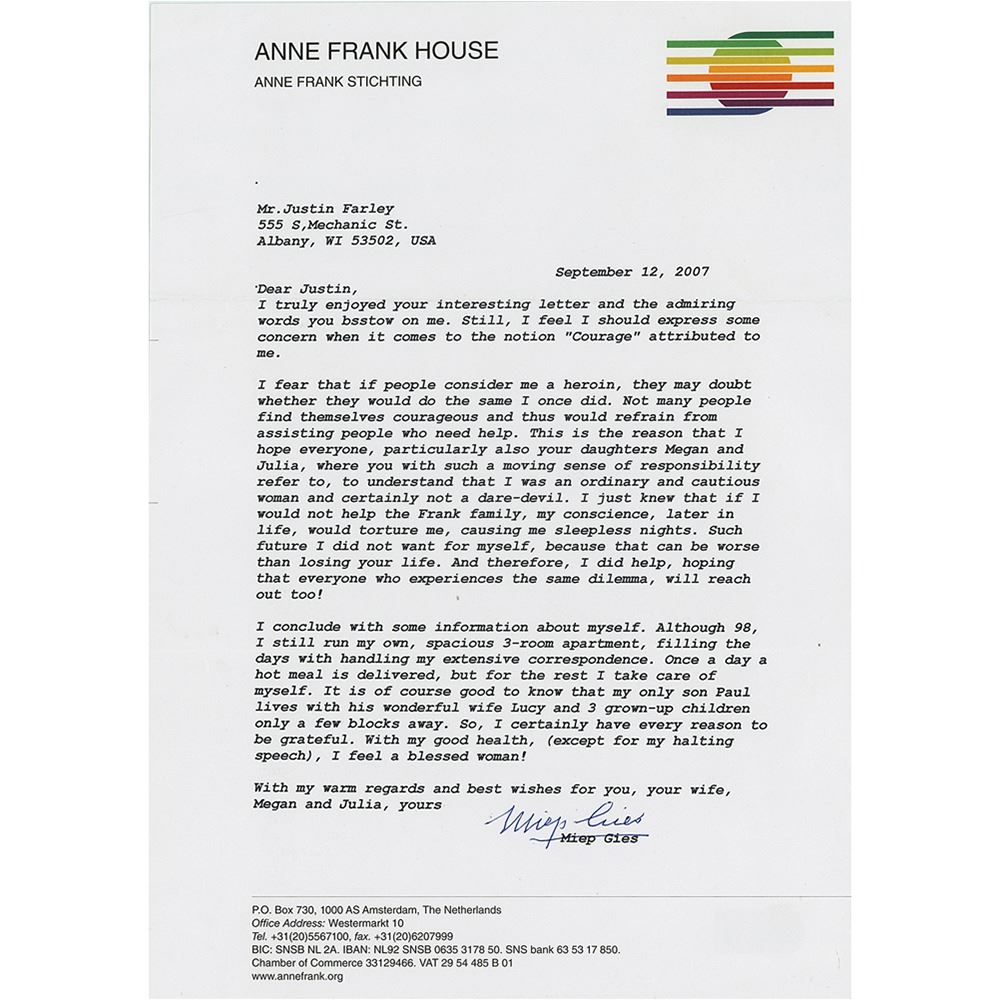 Dutch citizen (1909–2010) who hid Anne Frank, her family, and four other Dutch Jews from the Nazis during World War II. Together with her colleague Bep Voskuijl, she retrieved Anne Frank's diary after the family was arrested, and kept the papers safe until Otto Frank returned from Auschwitz in June 1945. TLS, one page, 8.25 x 11.75, Anne Frank House letterhead, September 12, 2007. Letter to Justin Farley in Wisconsin, in part: "I fear that if people consider me a heroine, they may doubt whether they would do the same I once did. Not many people find themselves courageous and thus would refrain from assisting people who need help. This is the reason that I hope everyone, particularly also your daughters…to understand that I was an ordinary and cautious woman and certainly not a dare-devil. I just knew that if I would not help the Frank family, my conscience, later in life, would torture me, causing me sleepless nights. Such future I did not want for myself, because that can be worse than losing your life. And therefore, I did help, hoping that everyone who experiences the same dilemma, will reach out too!." In fine condition. A significant and revealing letter by the celebrated custodian of Anne Frank and her legacy.