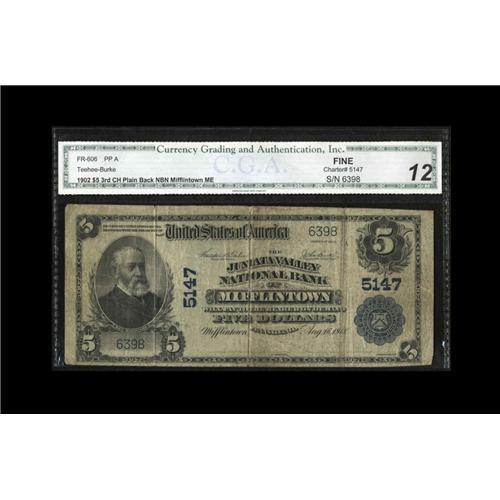 <B>Mifflintown, PA</B></I> - $5 1902 Plain Back Fr. 606 <B>The Juniata Valley NB </B></I> Ch. # 5147<BR>This example is housed in a <B>CGA Fine 12</B></I> holder.