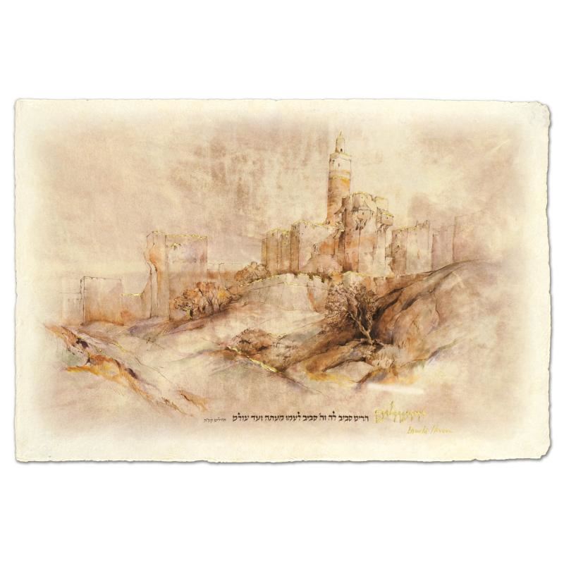 "Migdal David" is a mixed media giclee on handmade Indian paper with goldleaf by Brachi Horen, hand signed by the artist! This creation received personal attention by the artist in the form of water coloring and gilding. Includes Certificate of Authenticity! Measures approx. 23" x 15.5" (with border), 20" x 13" (image).