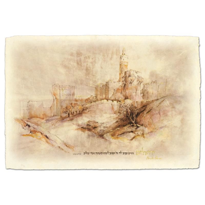 "Migdal David" is a mixed media giclee on handmade Indian paper with goldleaf by Brachi Horen, hand signed by the artist! This creation received personal attention by the artist in the form of water coloring and gilding. Includes Certificate of Authenticity! Measures approx. 23" x 15.5" (with border), 20" x 13" (image).