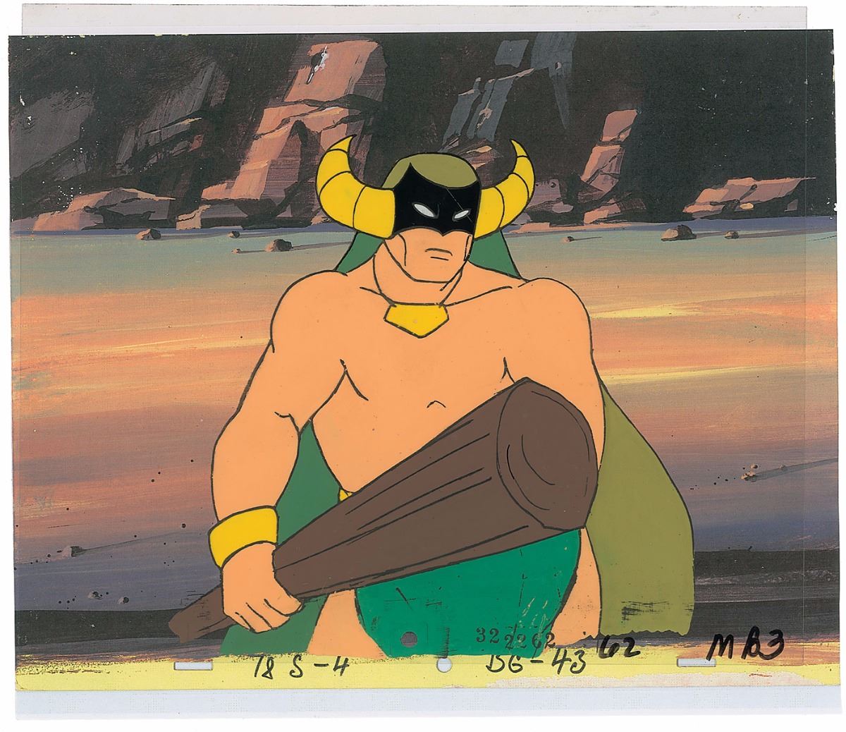 (Hanna-Barbera Studios, 1967) Original production cel featuring Mightor from Mighty Mightor, showing the club-carrying warrior against a rugged landscape. The cel is placed on a color copy background. Image measures 8.25 x 8.25, with overall dimensions of 13 x 11. In fine condition, with some scuffing to paint in lower portion and trivial soiling.