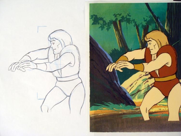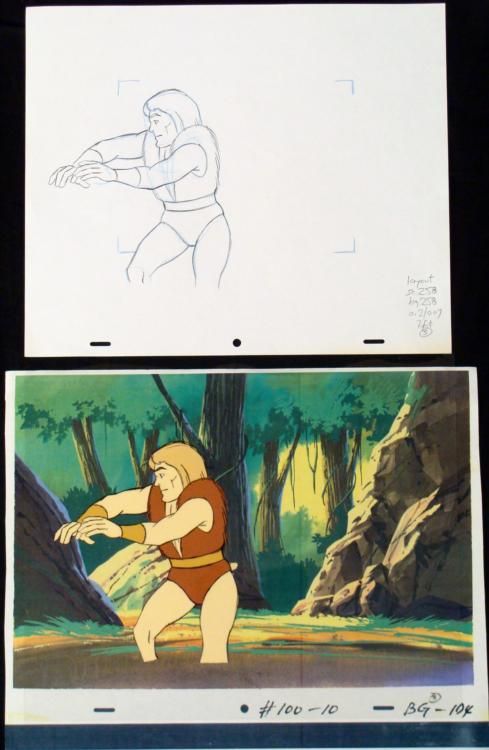This is an original animation cel, drawing, and printed background of an * unidentified character from the TV show "The Mighty * Hercules". * * * What can possibly be back here?!?!? * * <ul type="disc"> * Original Animation * Ce, Drawing, and Printed Background * Original "rough" * animation drawing, in black and non-photo blue with the notations in * black * Size of drawing: 10 1/2" x * 12 1/2" Size * of cel: 10" x 12 * 1/2" Size of background: 11" * x 13 3/4" * Excellent * Condition * This is an original hand-painted cel set-up * used in the production of an episode of "The Mighty Hercules". * Each one-of-a-kind * set-up represents a slight change in position of the characters. When * individually photographed and projected in rapid succession, * the images * appear to move. * * To create production cels, the original animator's drawing is * transferred onto an acetate cel (by hand-inking and/or photo copying). * The cel is then hand-painted on the reverse side. * The background that is accompanying this set-up is a reproduction * background. * * * * * The cel, printed background, and drawing are * ready to be * matted and framed. The animator's * notations are at the bottom of all three. * * *