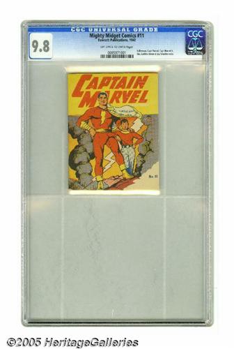 <B>Mighty Midget Comics Captain Marvel Adventures #11 (Fawcett, 1942) CGC NM/MT 9.8 Off-white to white pages.</B></I> Back cover is blank except for a war bonds seal. Overstreet 2005 NM- 9.2 value = $245. No CGC census data is available for the Captain Marvel issue, as CGC does not differentiate between the many different issues which are all numbered #11.