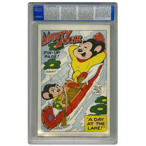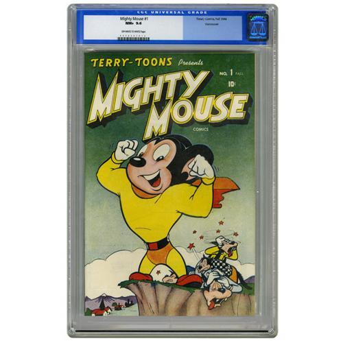 <B>Mighty Mouse #1 Vancouver pedigree (Timely, 1946) CGC NM+ 9.6 Off-white to white pages.</B></I> We feel comfortable asserting that this is the nicest existing copy of this issue. We have seen the Mile High copy, and while that one's fantastic too, it doesn't have the astonishing whites of this Vancouver book. We urge you to examine the back-cover scan on our website and you'll see what we mean! This was the first comic book devoted entirely to Mighty Mouse, who had previously appeared in the pages of <B>Terry-Toons Comics</B></I>. In the ensuing decades, generations of fans have enjoyed the character, who has been published by many different companies over the years -- it may surprise some that he began at the same company that published the Human Torch and Captain America! As such, both fans of the character and Timely completists will be competing for this item, and thus we expect spirited bidding for this one. Overstreet 2006 NM- 9.2 value = $1,850. CGC census 4/06: 2 in 9.6, none higher.