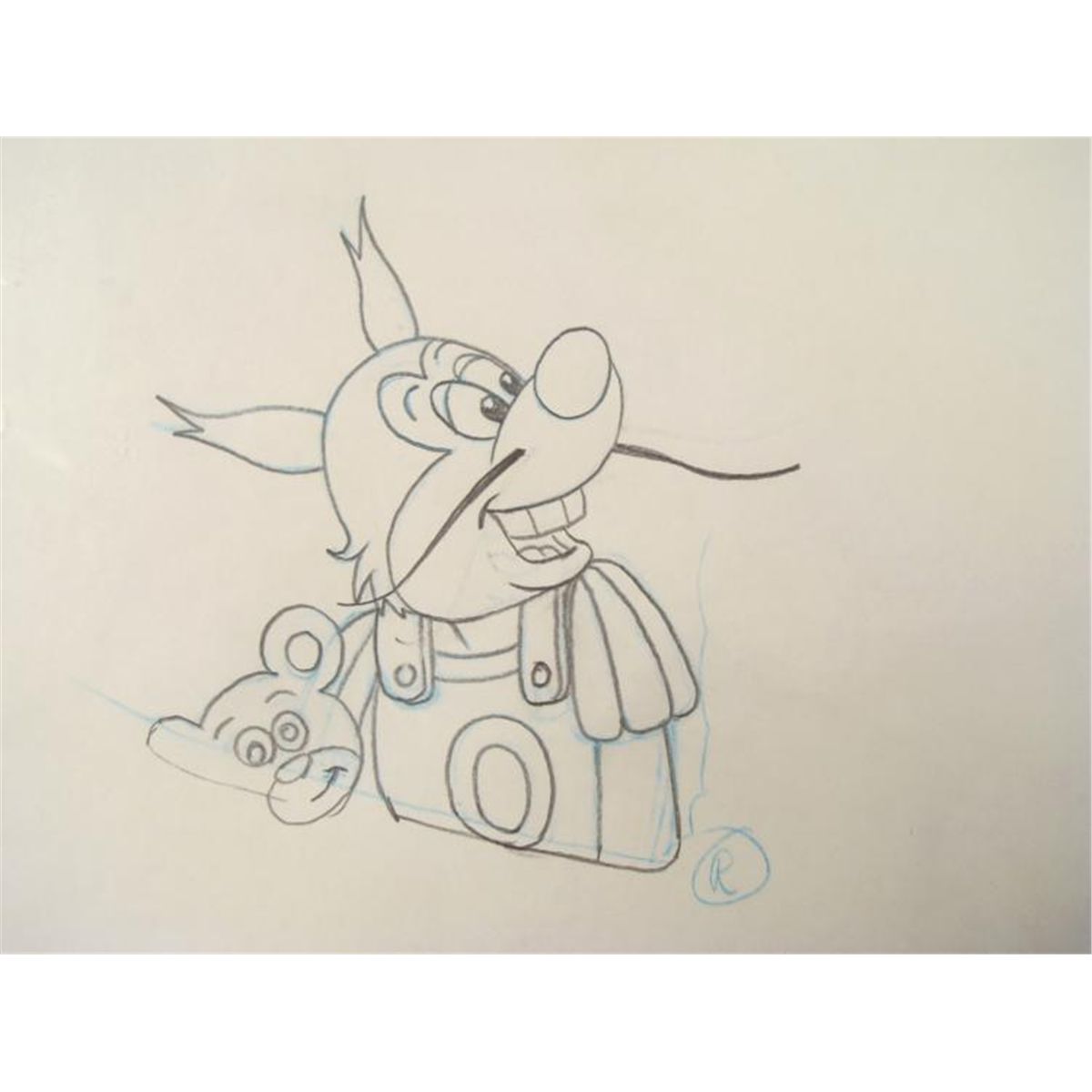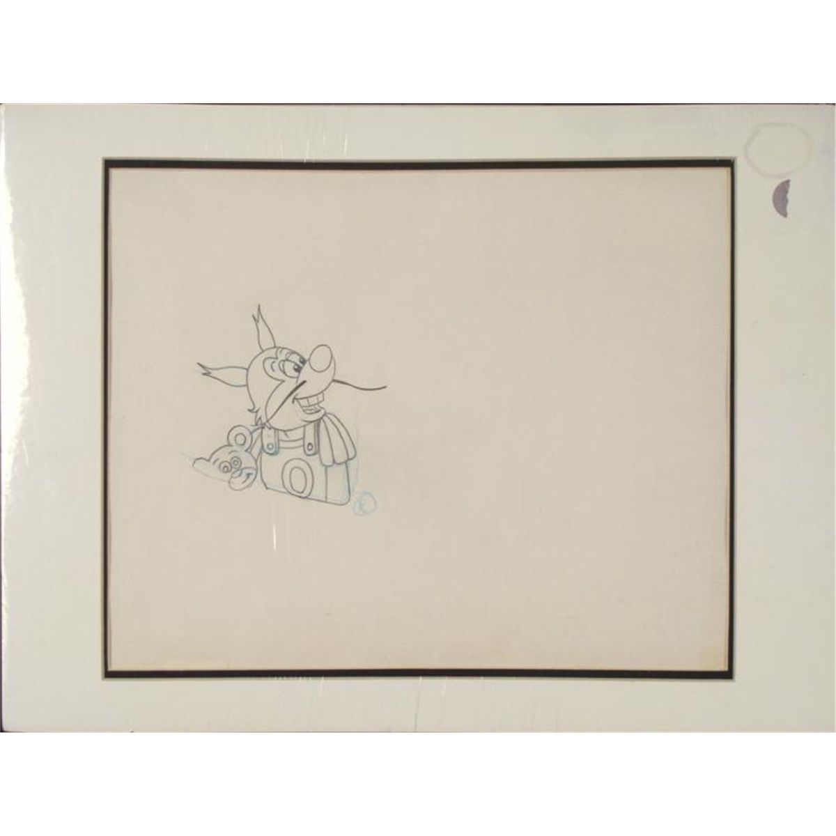 This is an original drawing used in the production of the Filmation cartoon Mighty Mouse. This is an image of the villain Oil Can Harry, looking actually quite innocent, with a little Teddy Bear. * Medium: Black and non-photo blue pencil on paperImage size: 11 1/2 x 9 1/2 inchesDetails: Animator's notation in bluePresentation: Double matted in black and white Matte size: 15 3/4 x 12 inchesCondition: Excellent; has a few light surface wrinkles, normal for a production drawing; sealed in cellophane