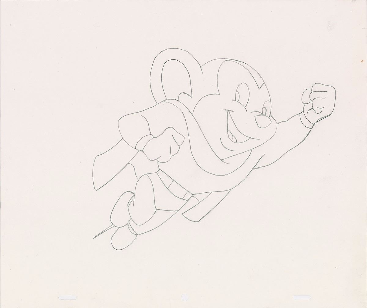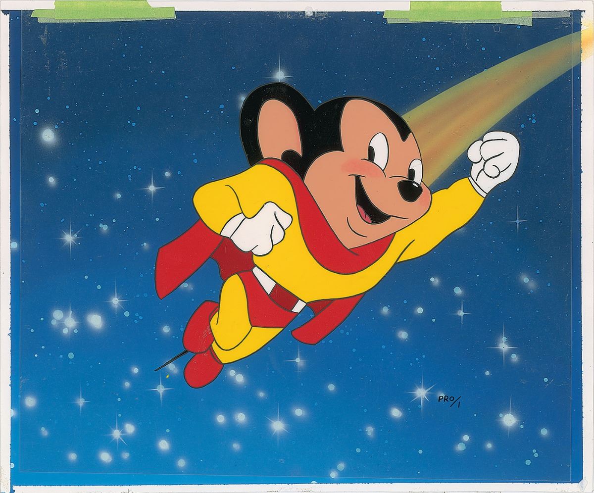 Limited edition hand-painted color model cel entitled ‘Mighty Mouse,’ 13.5 x 11, numbered PRO/1, featuring Mighty Mouse in his classic pose, flying through the air with fists clenched. The cel is placed over the original watercolor background used to create the limited edition artwork and is accompanied by the original unsigned matching graphite drawing on an off-white 12.5 x 10.5 sheet of illustration paper. In fine condition.