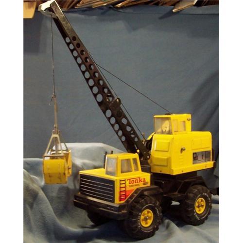 Here is a wonderful yellow Tonka Turbo-Diesel Metal Bucket Crane. This big machine is 17" long, 27 3/4" high with the crane up. The 20" long boom is complete with bucket. The cab swivels 360 degree. I was told it has been stored for 20 years. It is in good condition, but it has been played with. There some rust,the worst being on one side of the clam bucket, and the corner of one decal is loose. The tires have raised white letters reading TONKA XMB-975.