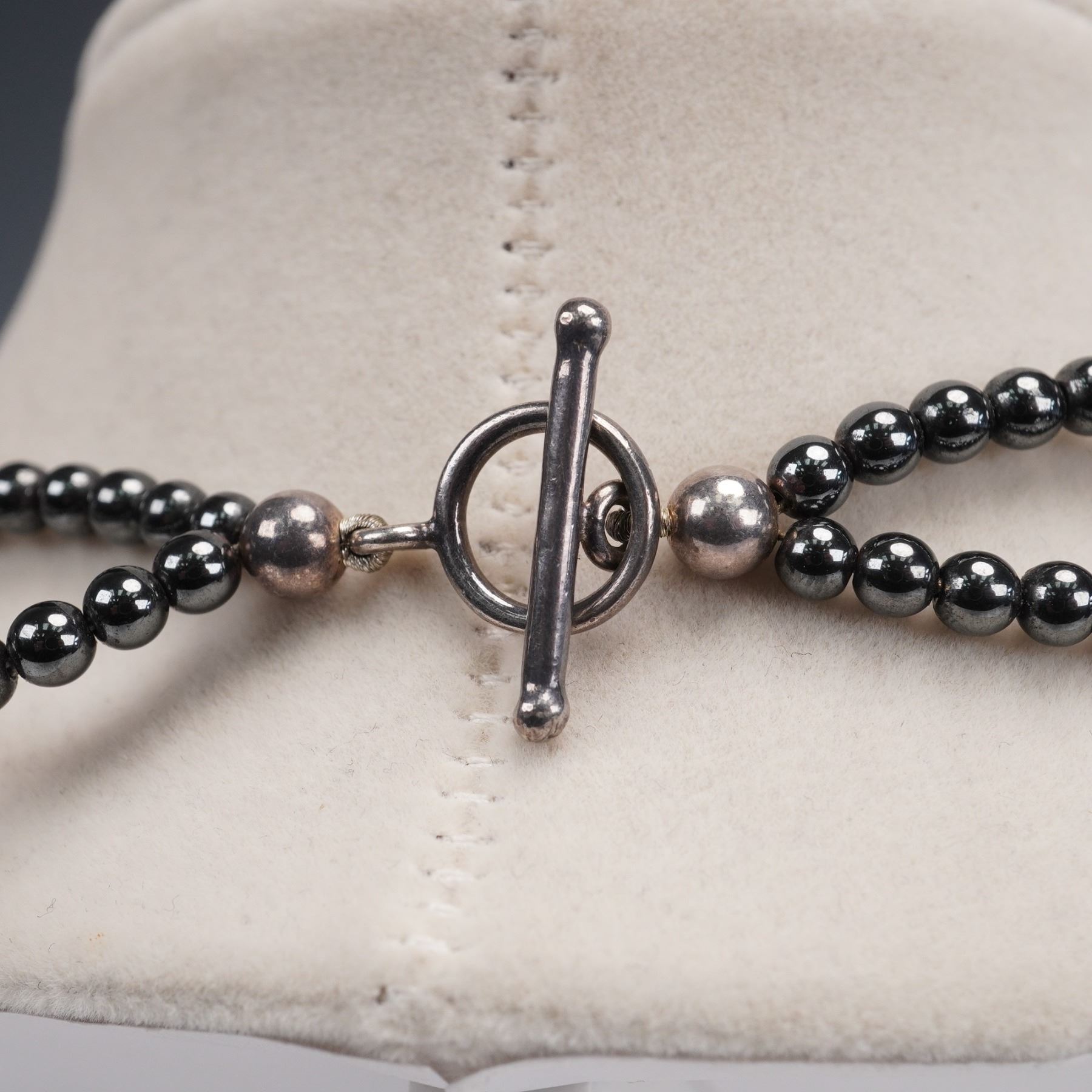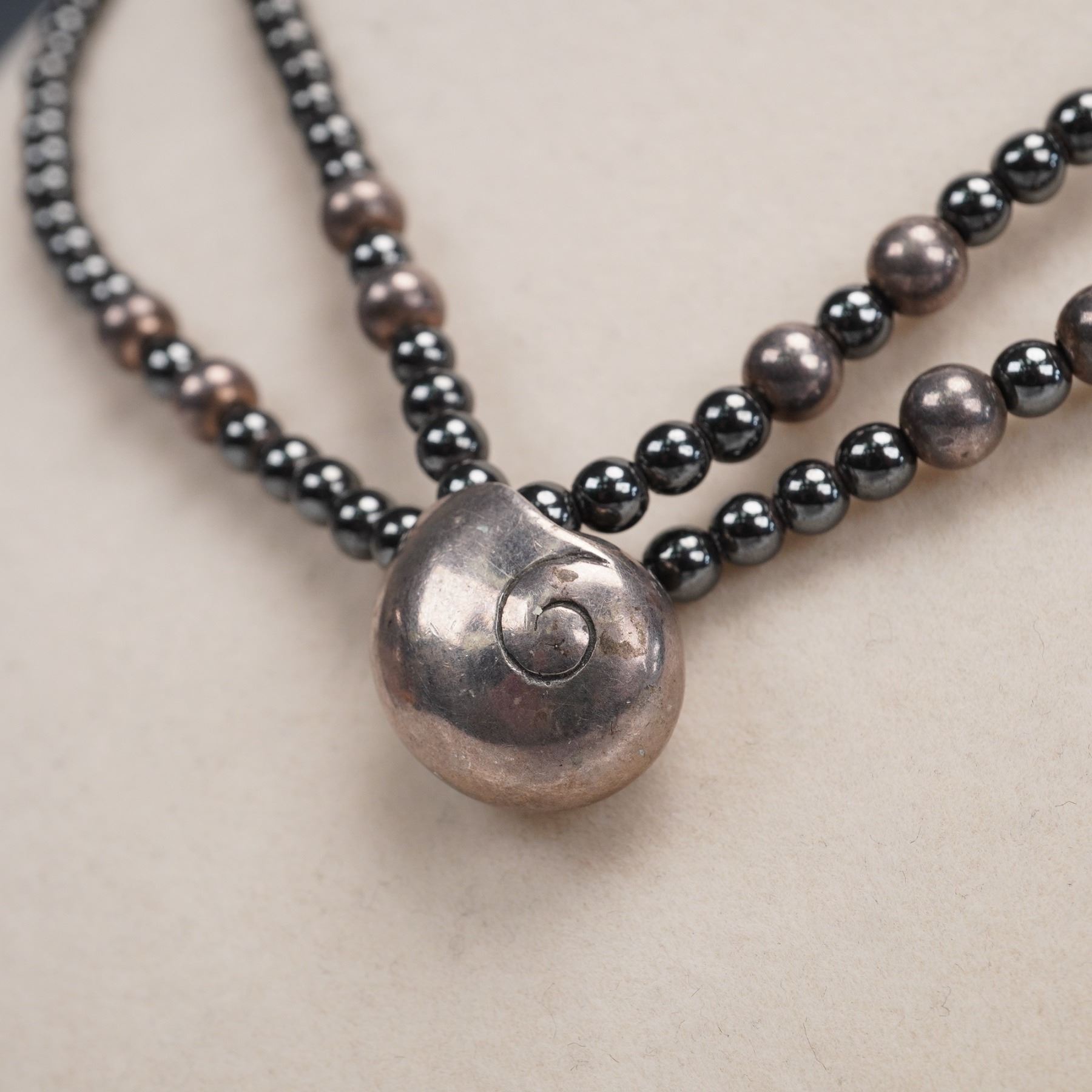 A distinctive designer necklace by Mignon Faget, featuring polished hematite beads arranged in a double strand with larger accent beads and a toggle clasp. At the center hangs a sterling silver pendant in the form of a stylized shell with a spiral motif, signed Mignon Faget and marked Sterling on the reverse. The hematite beads display a glossy metallic luster, complementing the smooth patina of the silver pendant. Mignon Faget, a New Orleans jewelry designer renowned for sculptural forms inspired by nature and the Gulf Coast, has been creating collectible pieces since 1969. This necklace exemplifies her celebrated blend of artistry and modern elegance. Weight approximately 40g.