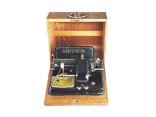 Mechanical construction with Latin letters, rotating platen, small carriage. Black metal plate casing, chromium-plated type-bars and keys. Wooden case. German, circa 1920 M: 35 x 33 x 22 cm