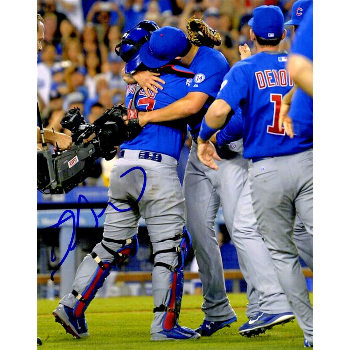Miguel Montero signed Chicago Cubs Jake Arrieta's no hitter celebration hug 8x10 photo. Photo is from Jake Arrieta's no hitter performance against the Dodgers which Miguel Montero was the catcher for. Item comes with a Schwartz Sports Memorabilia tamper-proof numbered hologram and Certificate of Authenticity which can be verified online.