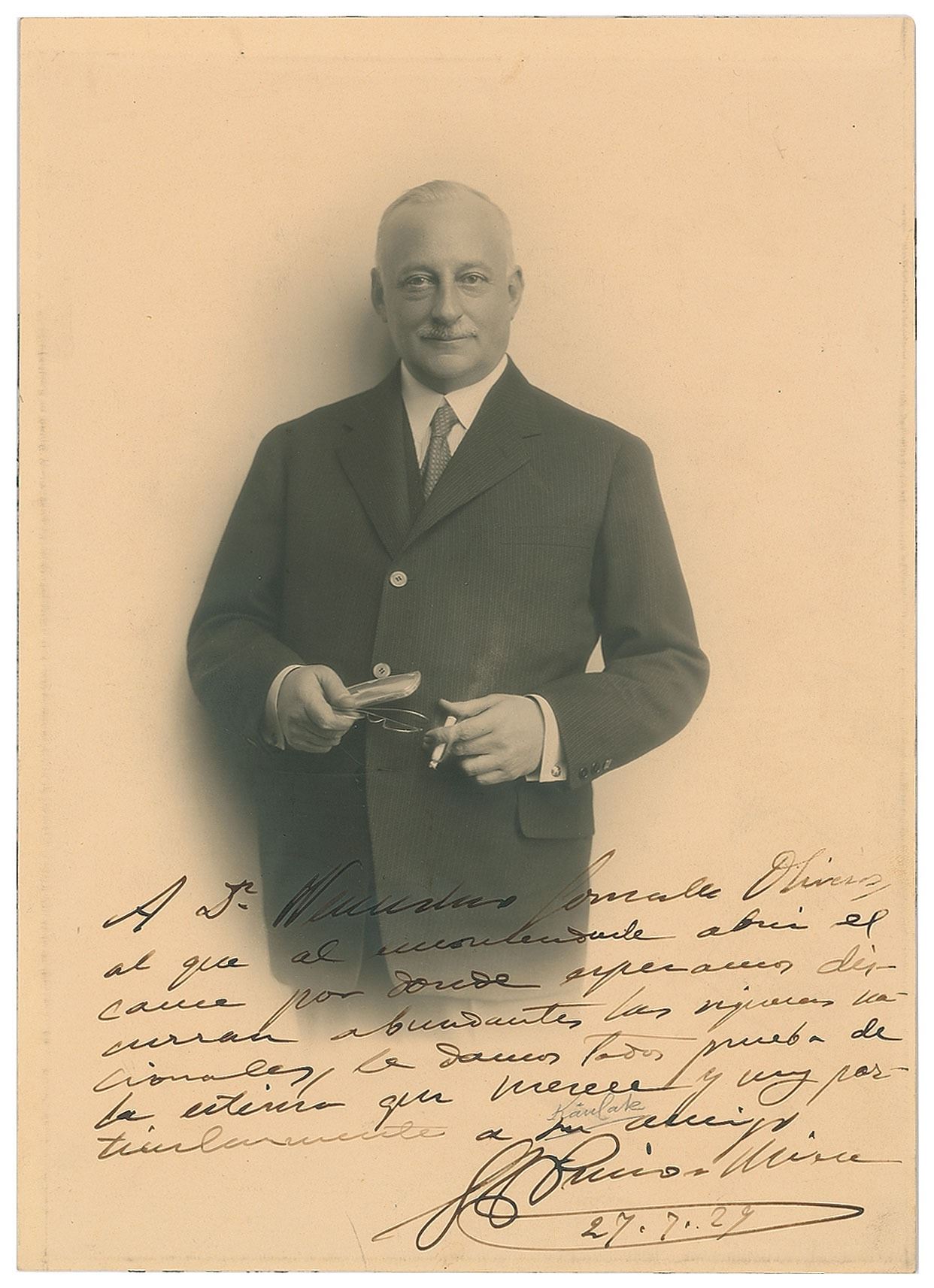 Vintage matte-finish 7.75 x 10.75 portrait of the Prime Minister of Spain wearing a handsome pinstripe suit, signed in fountain pen, "M. Primo de Rivera, 27. 7. 29," who adds a lengthy inscription in Spanish. Affixed to a same-size cardstock mount. In fine condition, with light toning from prior display.