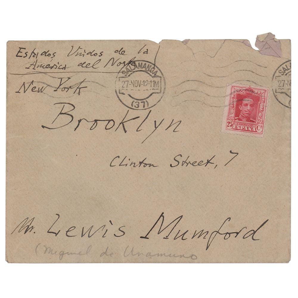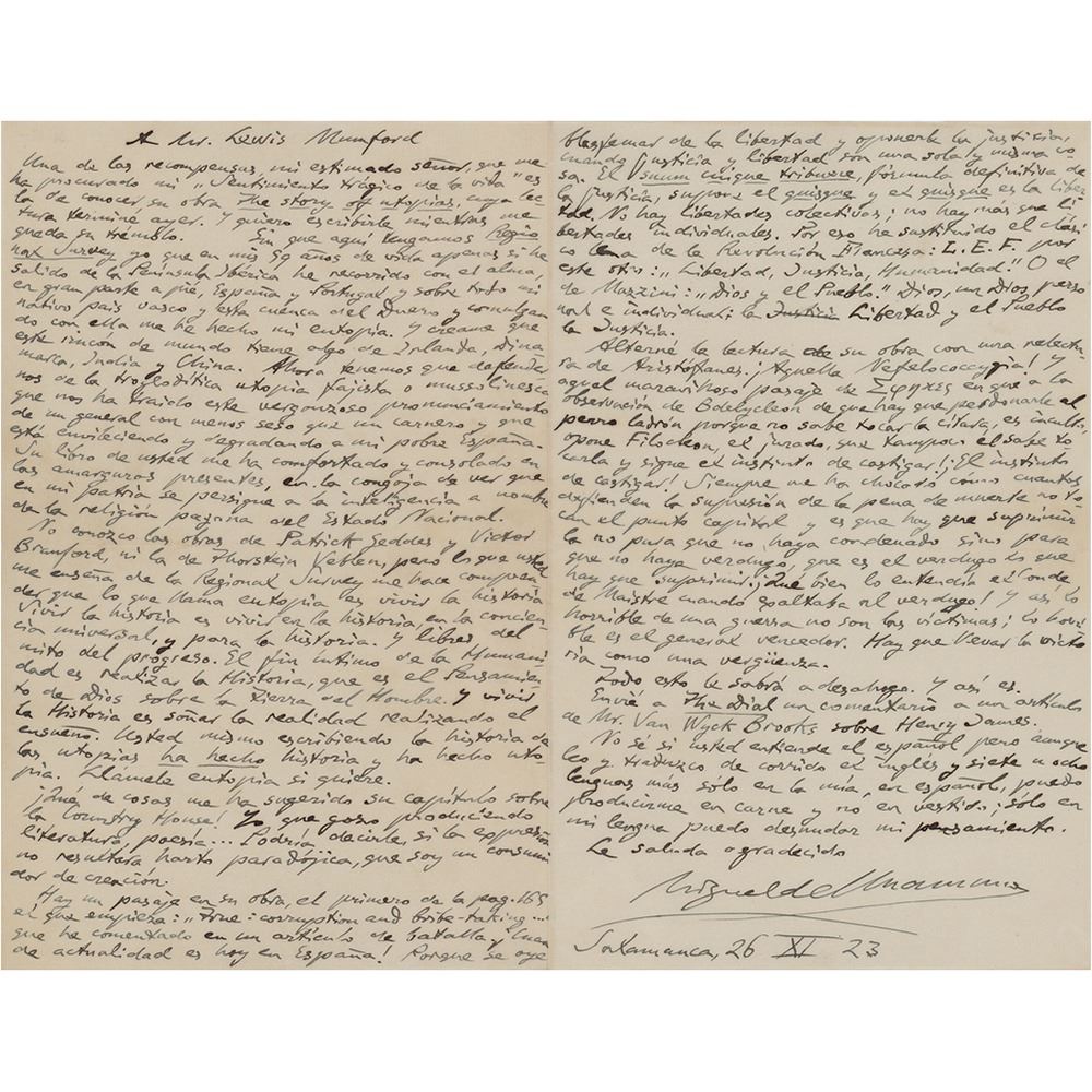 Very rare ALS in Spanish, two pages on two adjoining sheets, 5 x 8, November 26, 1923. Lengthy handwritten letter to writer and critic Lewis Mumford, shortly after a military coup brought Miguel Primo de Rivera to power in 1923. In part (translated): "One of the recompenses, esteemed sir, which have been obtained for me by my 'Sentimiento tragico de la vida' is that of becoming acquainted with your work The Story of Utopias, the reading of which I finished yesterday. And I want to write to you while its tremor remains with me. Without our having here a Regional Survey, I, who in my 59 years of life have scarcely left the Iberian Peninsula, have gone over with all my soul, largely on foot, Spain and Portugal and above all my native Basque country and this basin of the Duero, and, communing with it, have made for myself my utopia. And believe me that this corner of the world has something of Ireland, Denmark, India and China. Now we have to defend ourselves against the troglodytic Fascist or Mussoliniesque utopia which has been brought to us by this shameful pronouncement of a general with less brains than a sheep and who is making vile and degrading my poor Spain. Your book has comforted and consoled me in the present bitterness, in the affliction of seeing that in my country intelligence is persecuted in the name of the pagan religion of the National State…What your book tells me…makes me understand that what you call utopia is to live history. To live history, is to live in history, in the universal consciousness, and for history, free from the myth of progress. The intimate object of humanity is to realize history, which is the thought of God on the earth of man. And to live history is to dream reality through realizing the dream You, yourself, writing the history of utopias have made history and have made a utopia…I who take enjoyment in producing literature, and poetry might tell you, if the expression did not appear so paradoxical, that I am a consumer of creation." In fine condition. Accompanied by the original mailing envelope (addressed in Unamuno's hand), and a complete translation.